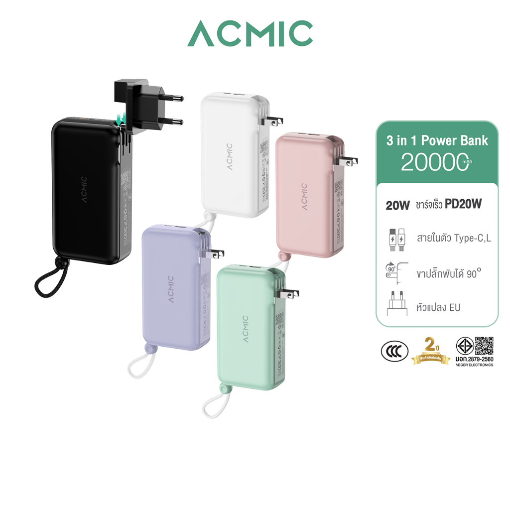 [มีCCC ส่งด่วน] ACMIC APC20-02PD Powerbank20000mAh พาวเวอร์แบงค์ ชาร์จเร็วPD20W สายชาร์จในตัว ประกัน 2ปี