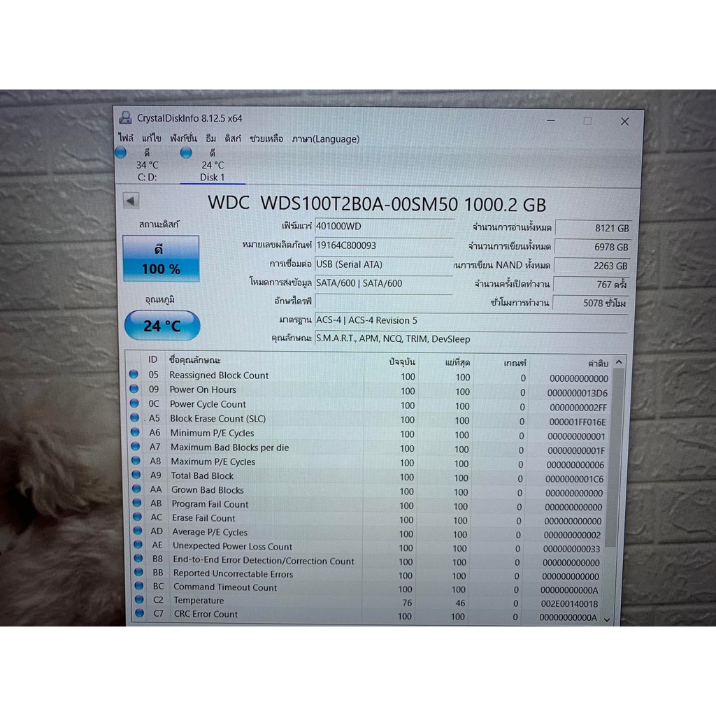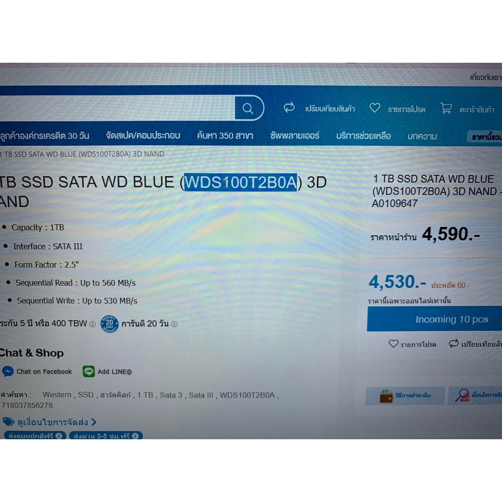 1 TB. SSD SATA WD BLUE (WDS100T2B0A) 3D NAND มือสองสภาพดีประกันศูนย์ 07/2024