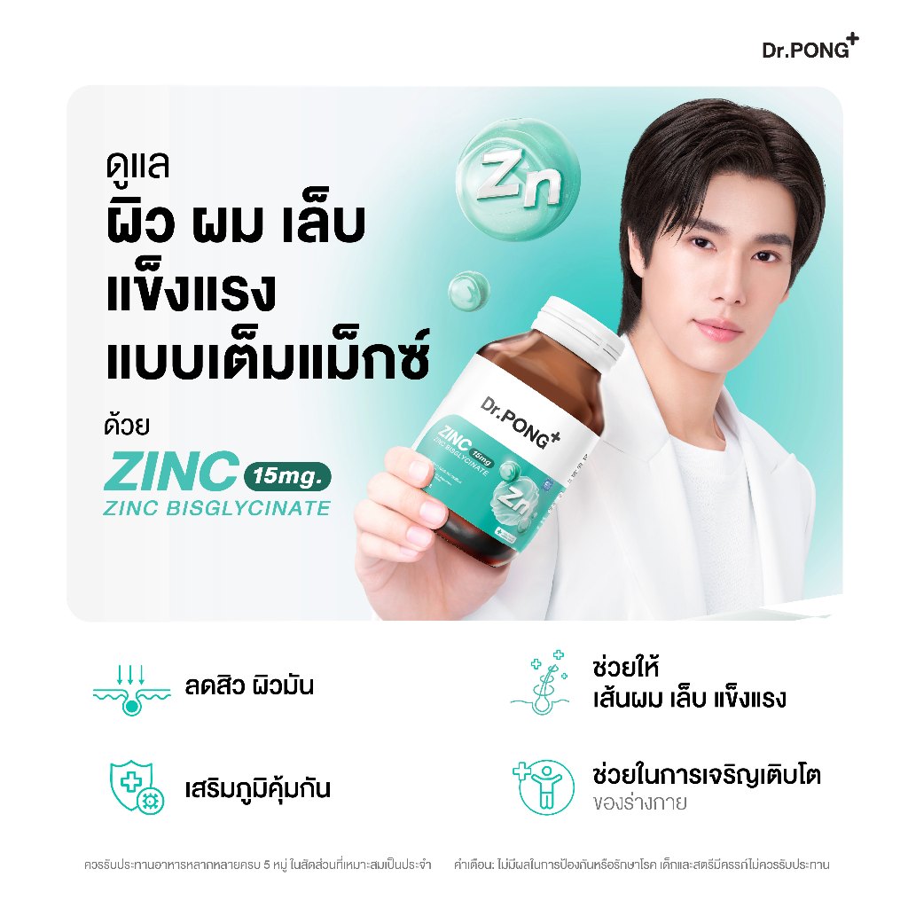 Dr.PONG Zinc Bisglycinate ซิงค์ บิสกลีซิเนต 15มก ดูดซึมดี ช่วยเสริมภูมิ คุมมัน ลดสิว ดูแลผิว ลดผมร่วง บำรุงเล็บ