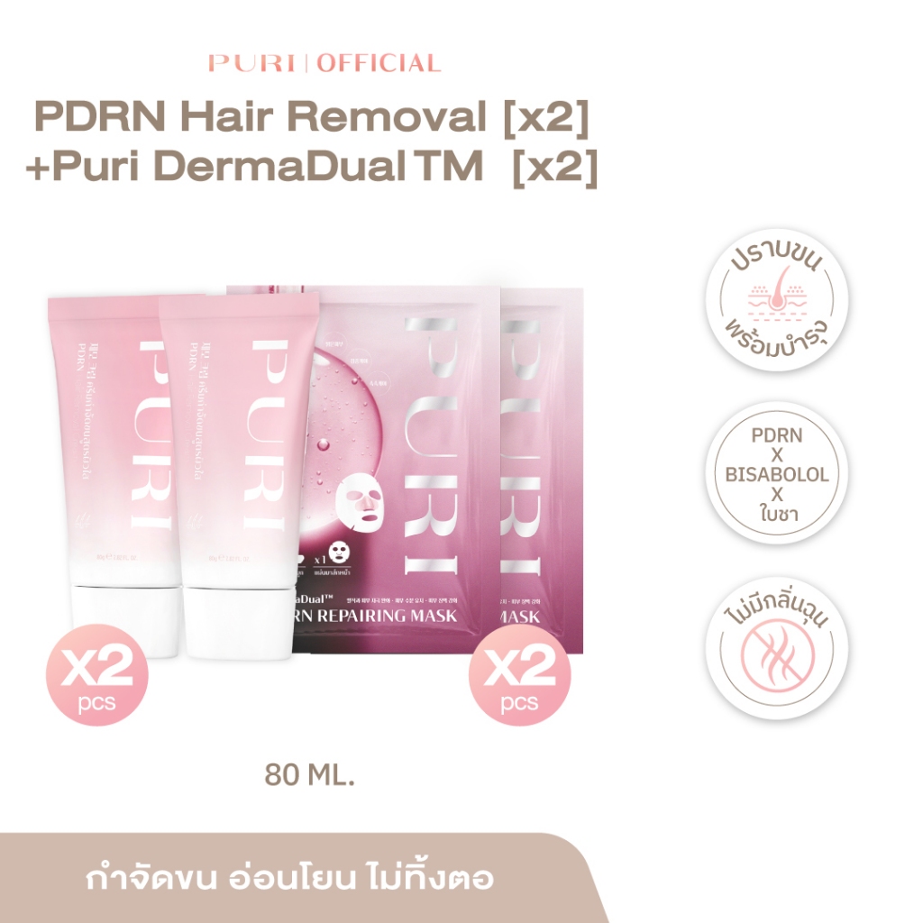 [2แถม2]PURI PDRN HAIR REMOVAL CREAM ครีมกำจัดขน 2 ชิ้น แถมฟรี! มาส์กฟื้นฟูผิวPDRN 2 ชิ้น