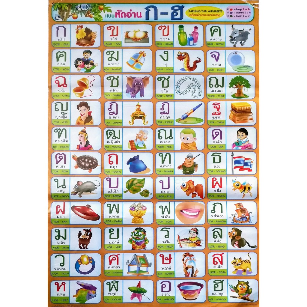 โปสเตอร์แบบหัดอ่าน ก-ฮ พร้อมคำภาษาอังกฤษ