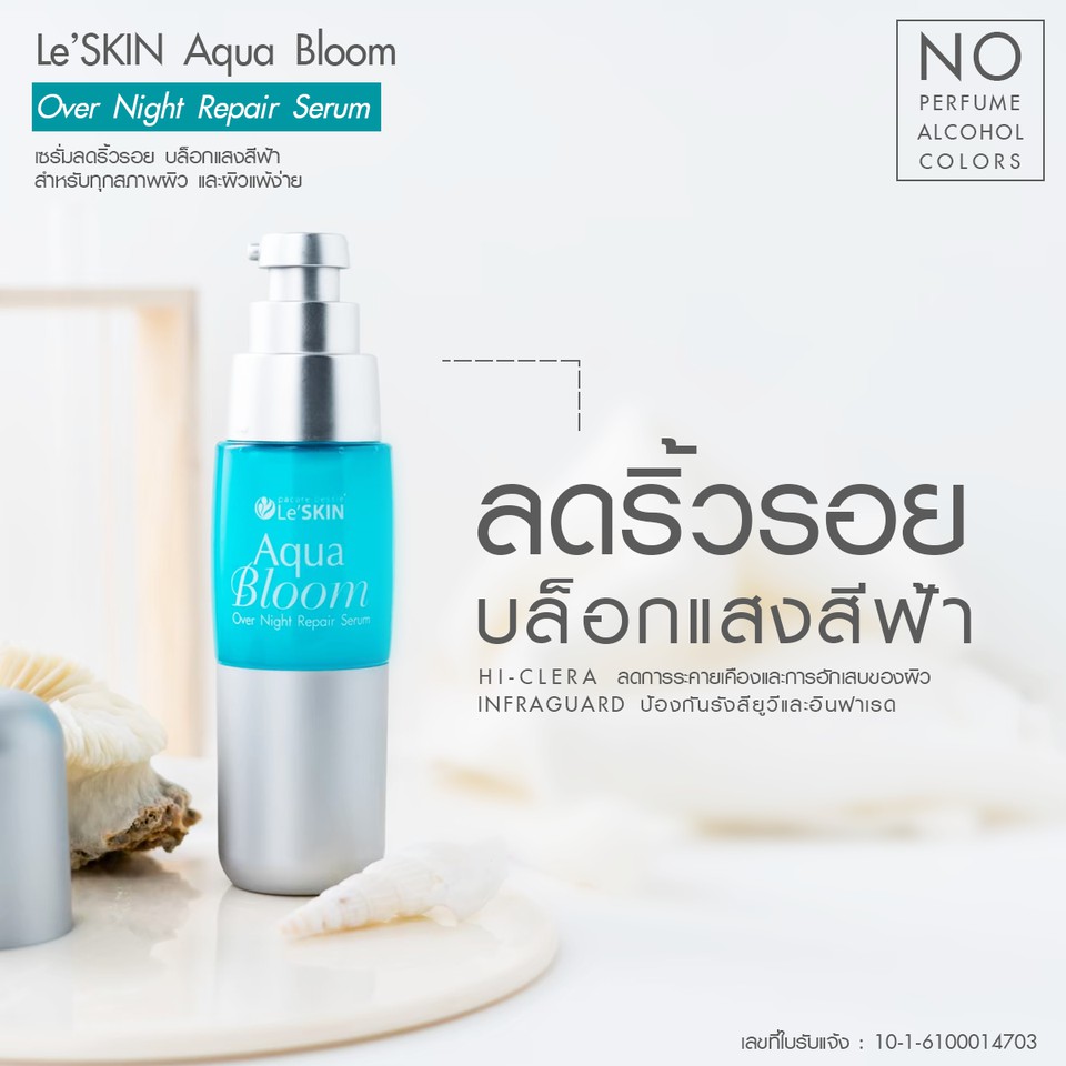 เลอสกิน อควาบลูม ไนท์ รีแพร์ เซรั่ม ขนาด 50 มล. ลดริ้วรอย ซ่อมแซมผิวอ่อนล้า ผิวชุ่มชื้น กระชับรูขุมขน