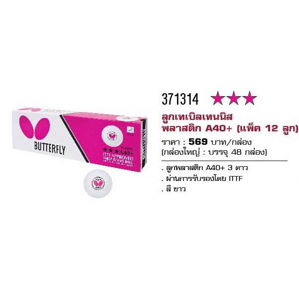 -- ลูกปิงปอง ลูกเทเบิลเทนนิส butterfly 3 ดาว พลาสติก a40+ (แพ็ค 12 ลูก) y