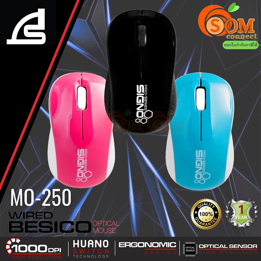 MOUSE (เมาส์สาย) SIGNO MO-250 (BESICO) USB2.0 สาย1.5M (มี 3 สี สีดำ/สีฟ้า/สีชมพู) ประกัน 1 ปี *ของแท้