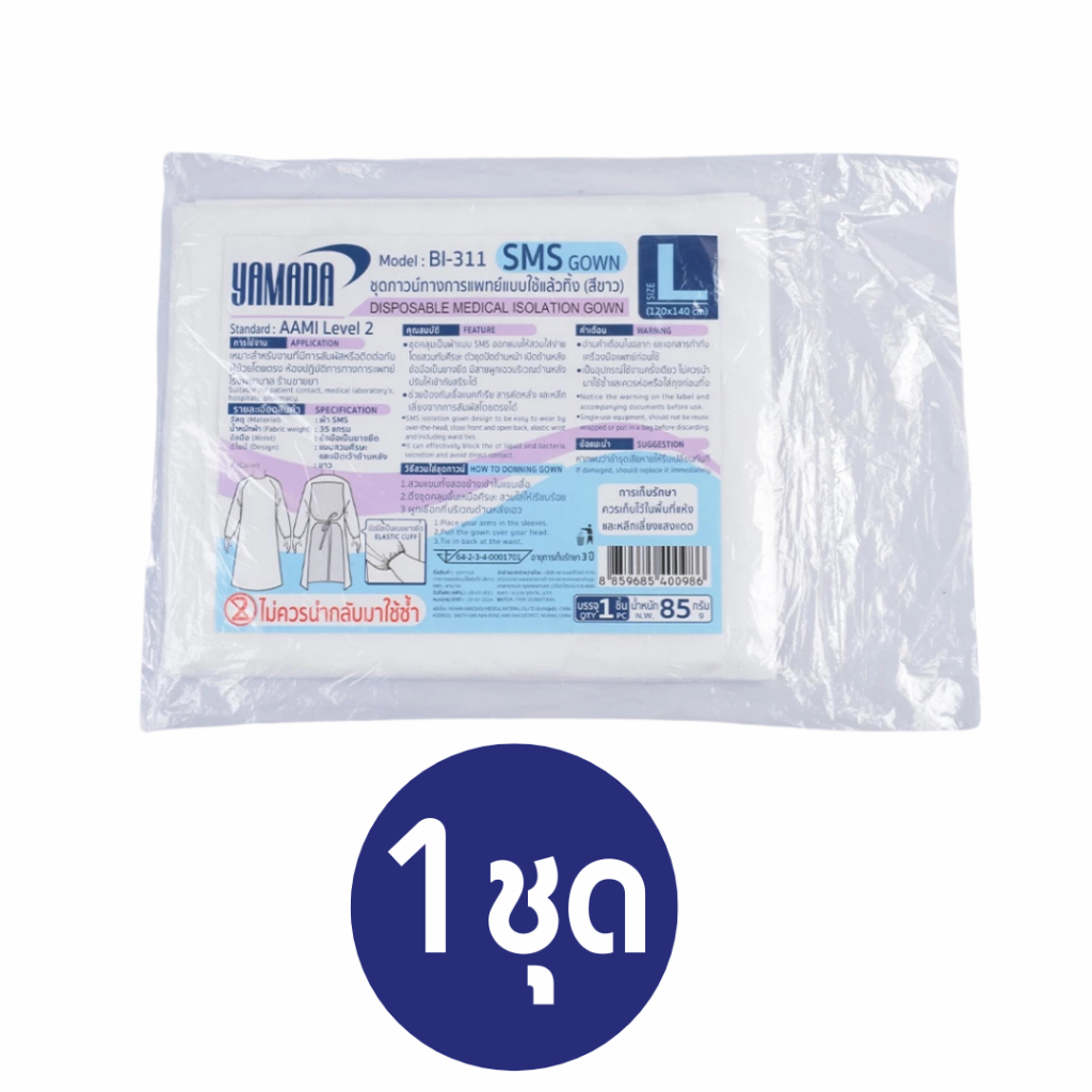 Yamada ชุดคลุมพลาสติก ชุดกาวน์ ทางการแพทย์ แบบใช้แล้วทิ้ง SMS (สีขาว) รุ่น BI-311(แพ็ค1ชุด)