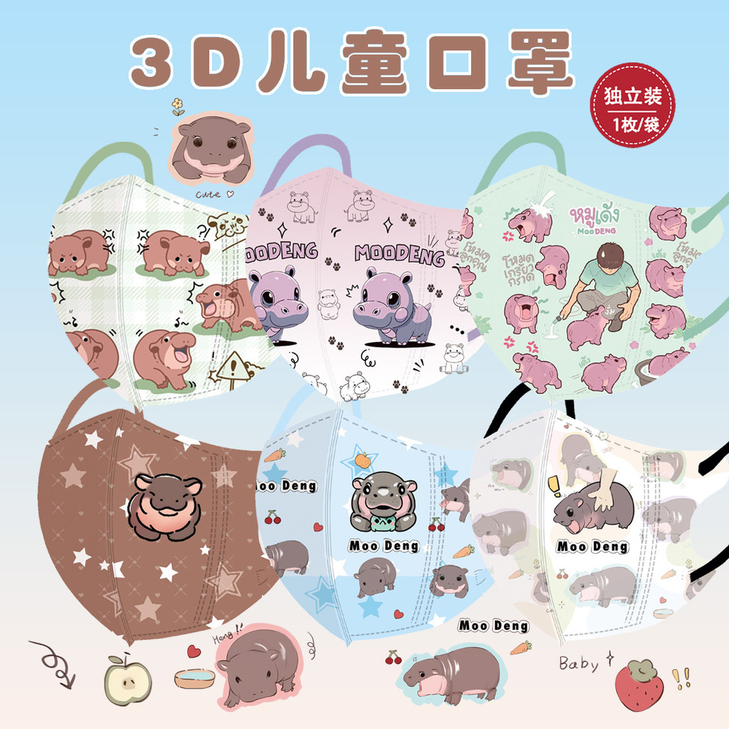 Pygmy Hippopotamus 3D หน้ากากเด็ก 3-12age สามมิติการ์ตูน Hippo การพิมพ์หน้ากากเด็กบรรจุภัณฑ์อิสระ 50 ชิ้น MOO DENG หน้ากาก