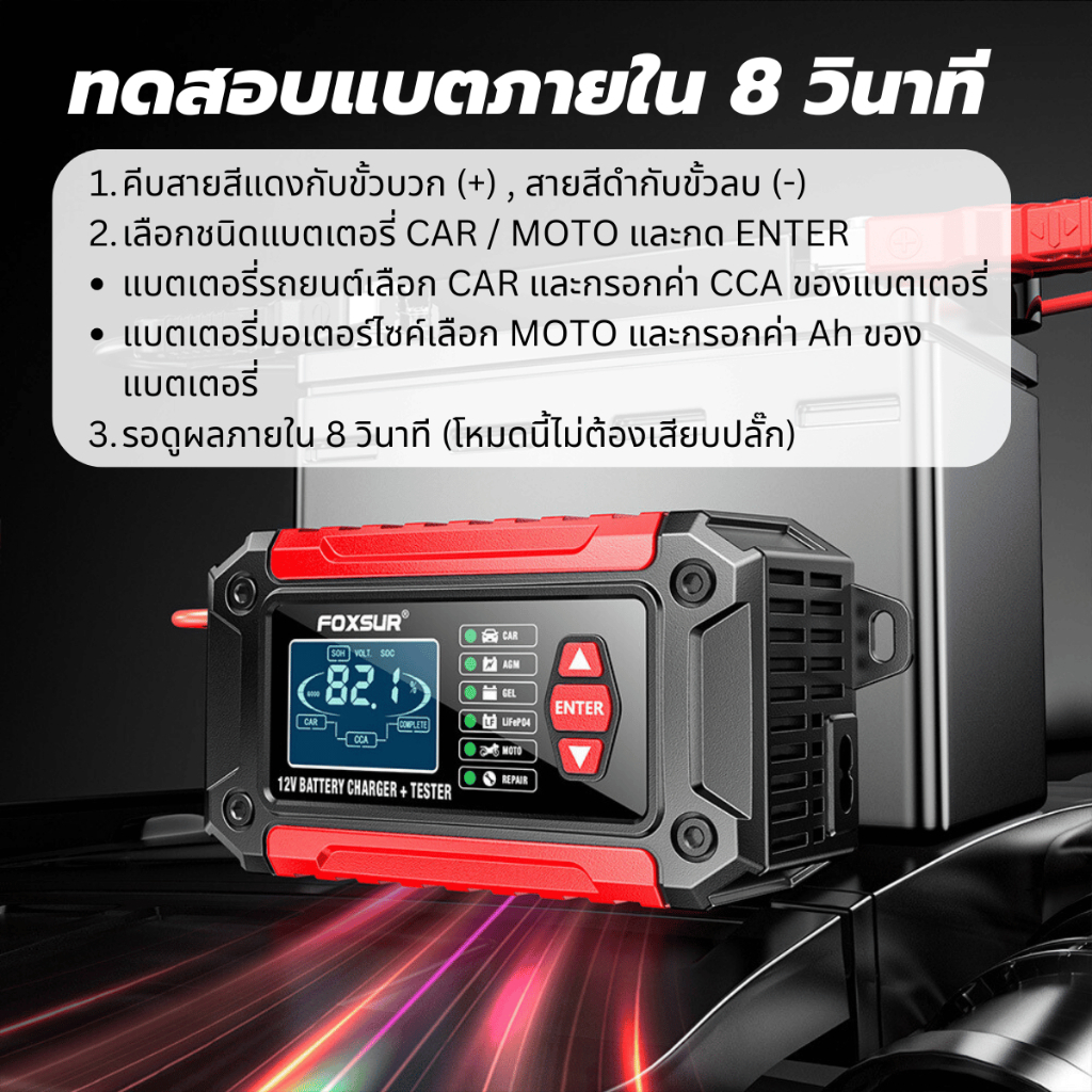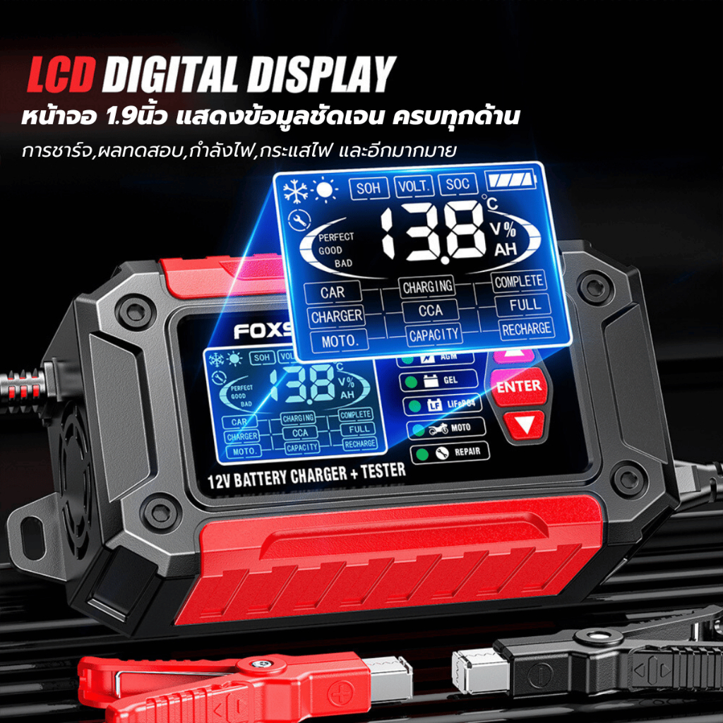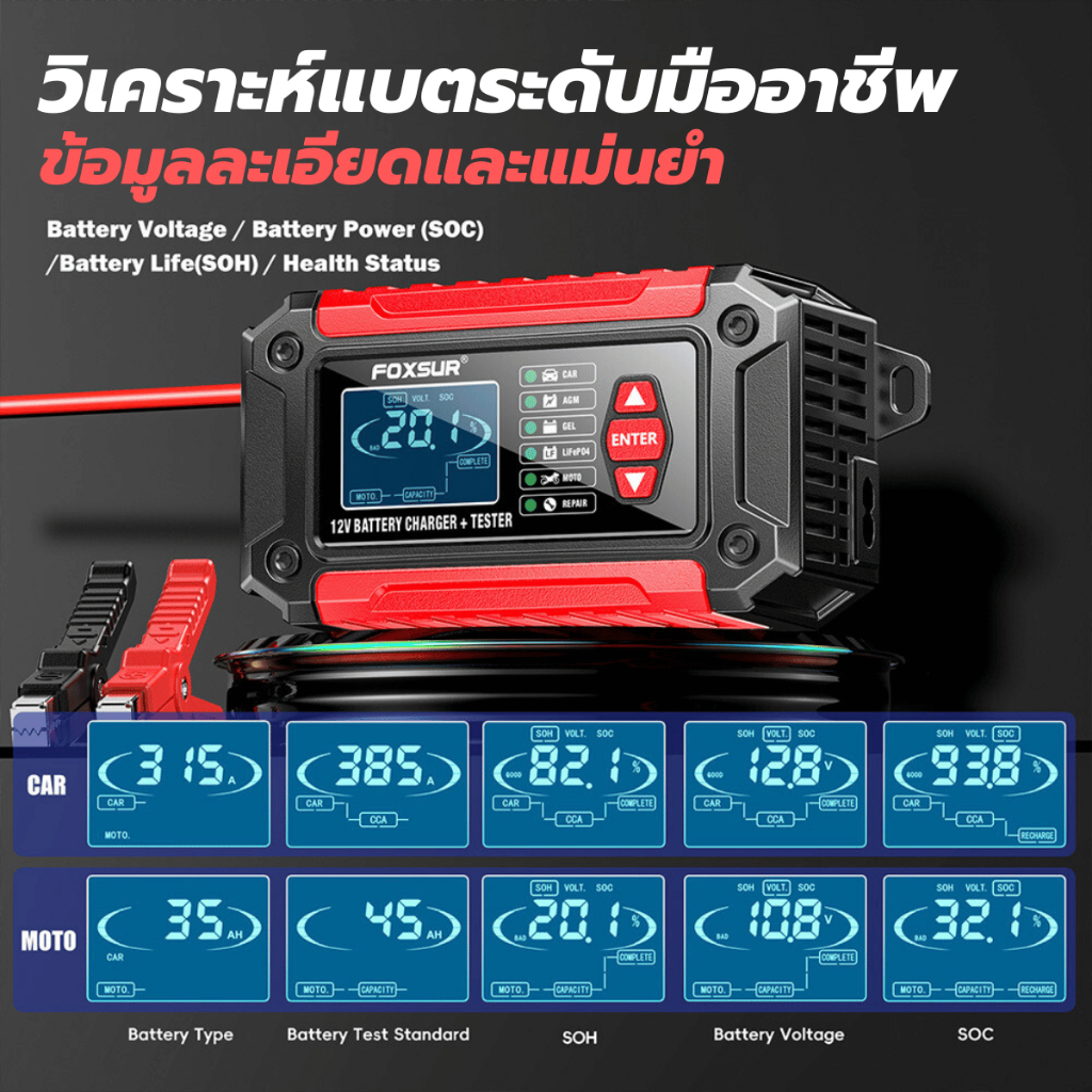 FOXSUR 2IN1 ชาร์จแบต เครื่องชาร์จแบตรถยนต์ เครื่องชาร์จแบตเตอรี่รถยนต์ ที่ชาร์จแบตรถ มอไซค์ ฟื้นฟูค่าCCA SOC SOH วิเคราห