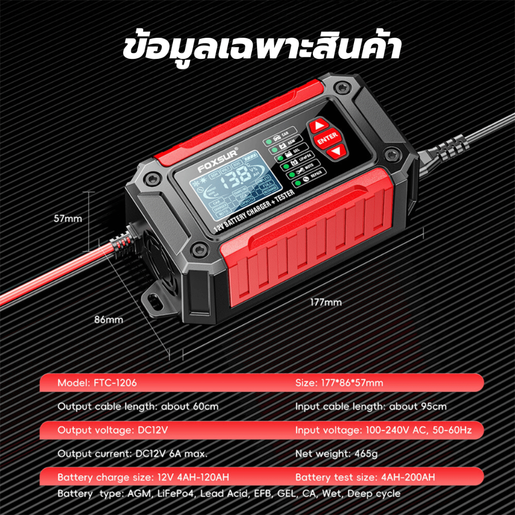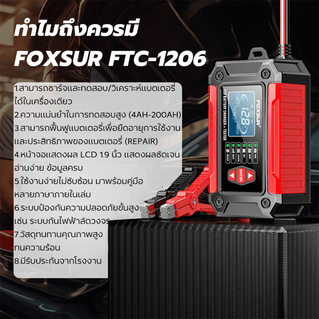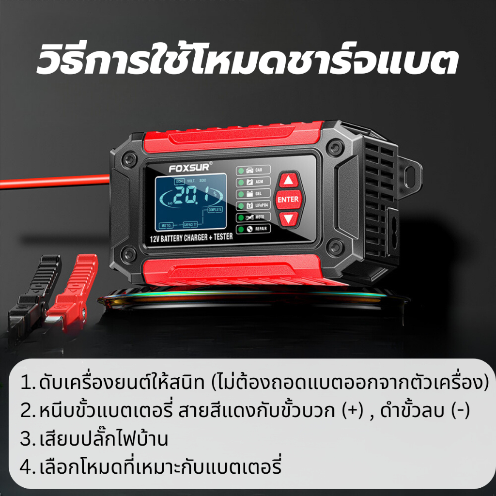 FOXSUR 2IN1 ชาร์จแบต เครื่องชาร์จแบตรถยนต์ เครื่องชาร์จแบตเตอรี่รถยนต์ ที่ชาร์จแบตรถ มอไซค์ ฟื้นฟูค่าCCA SOC SOH วิเคราห