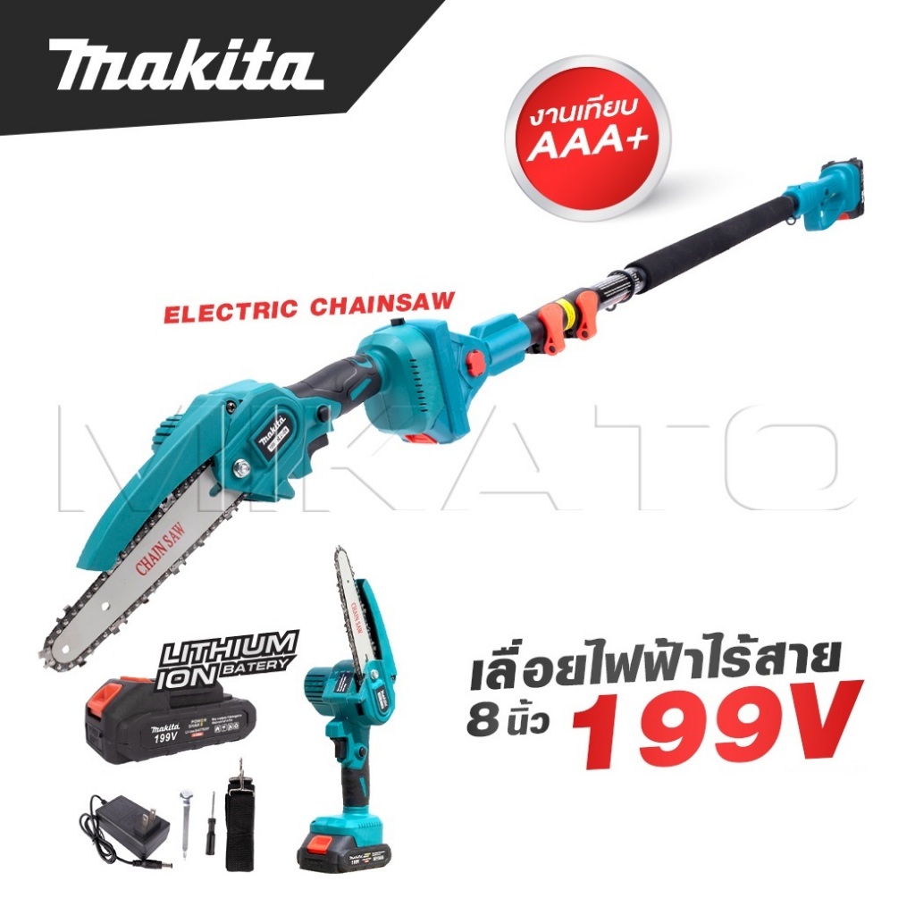 MAKITA เลื่อยโซ่ไร้สาย 199V บาร์ 8 นิ้ว มาพร้อมด้ามต่อยาวสำหรับใช้งานที่สูง 3 เมตร ถูกมาก