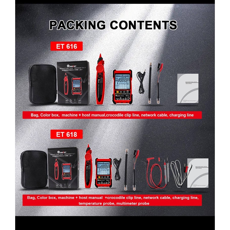 เครื่องทดสอบสายเคเบิลเครือข่าย ET616 ET618 พร้อมหน้าจอ LCD ดิจิทัล POE