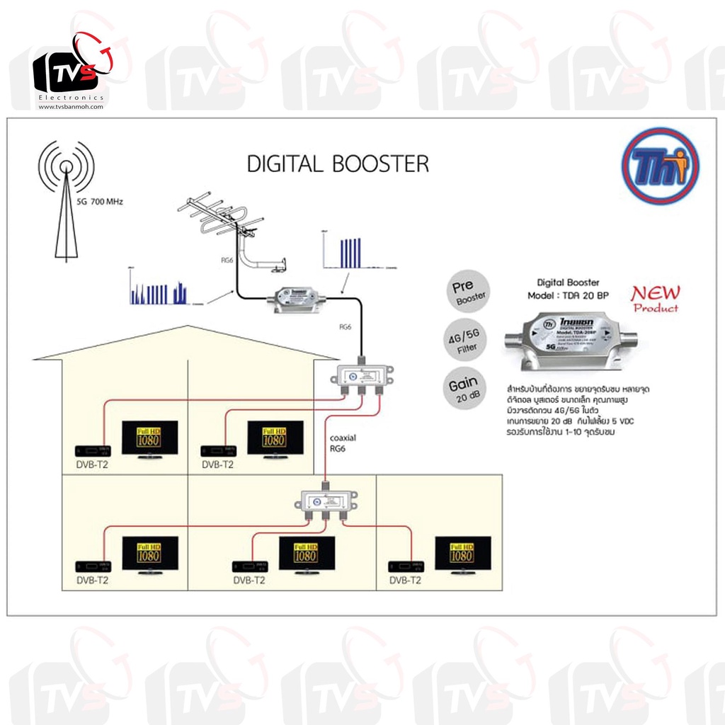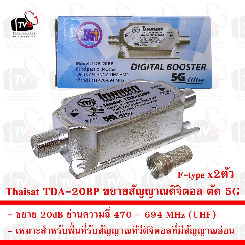 Thaisat Digital Booster TDA-20BP อุปกรณ์ขยายสัญญาณดิจิตอล ตัด 5G แถม F-Type 2ชิ้น
