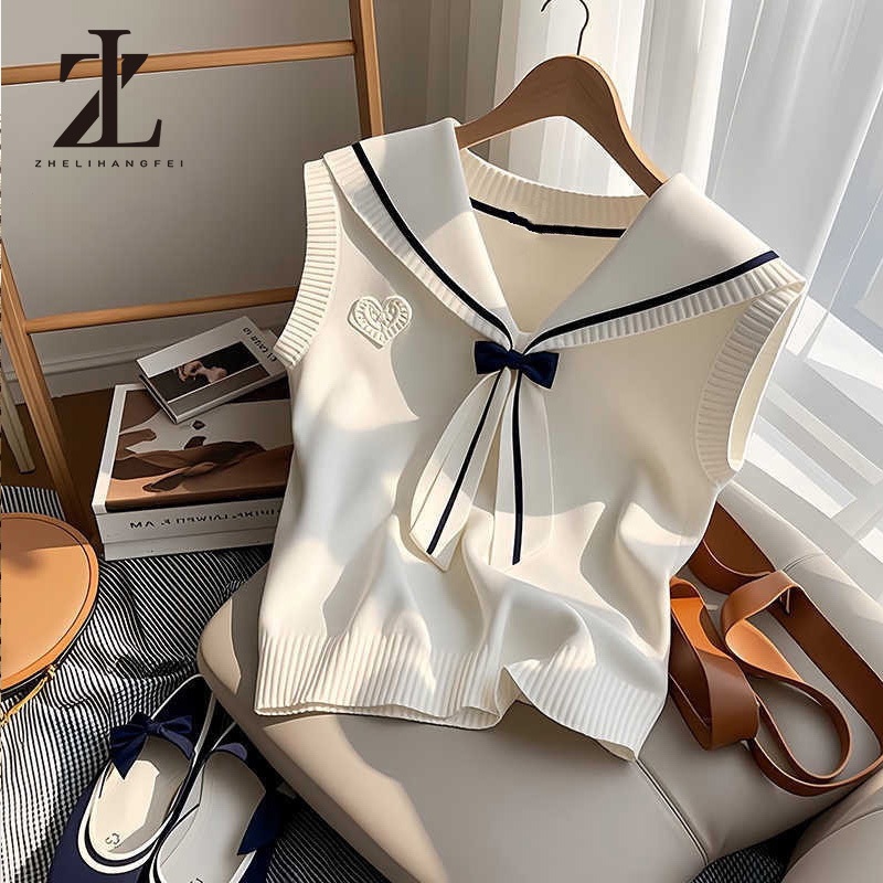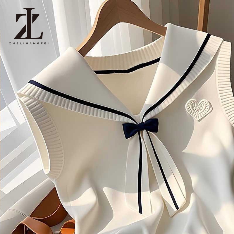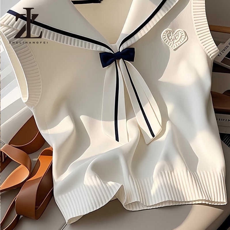 ZHELIHANGFEI เสื้อกั๊กคอโบว์สีกรมท่าเสื้อถักเกาหลีผู้หญิงแบบใหม่ฤดูร้อน