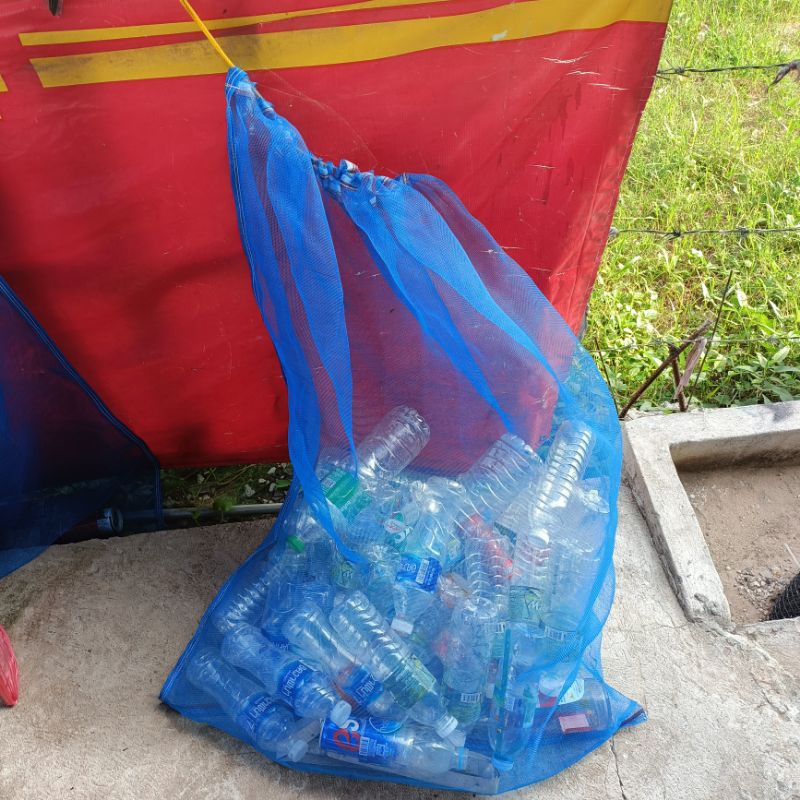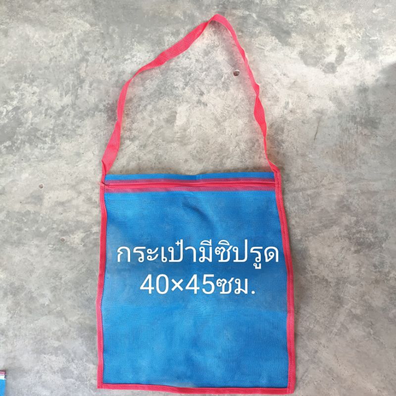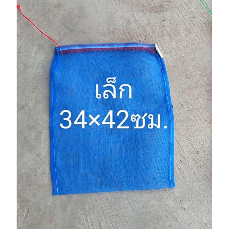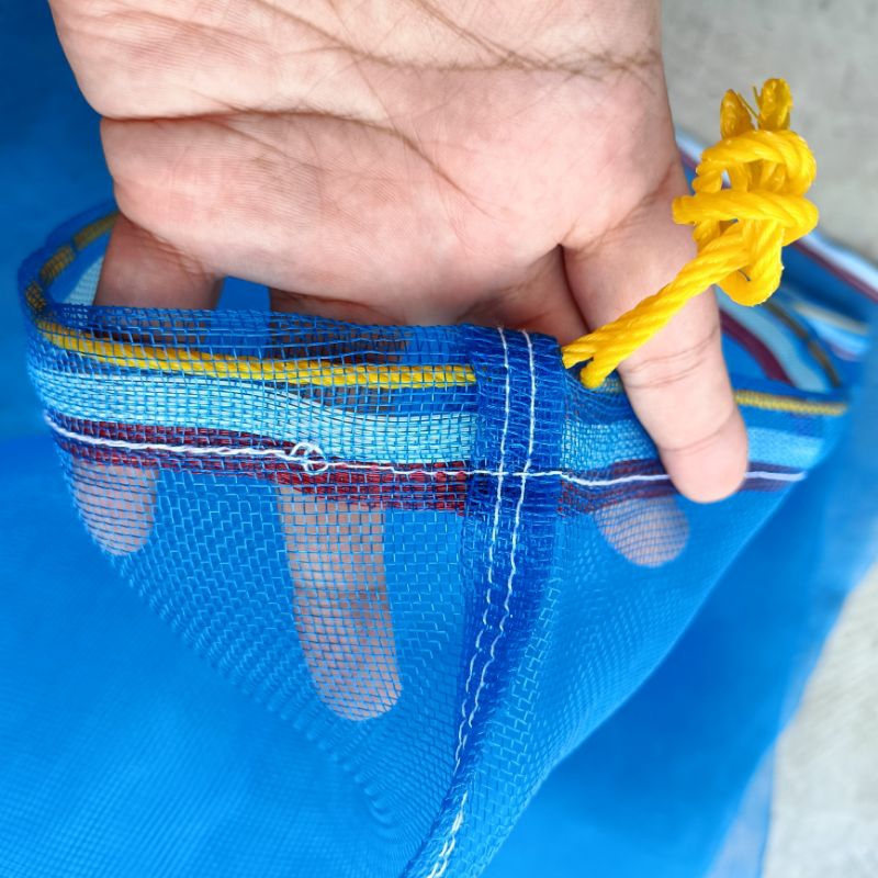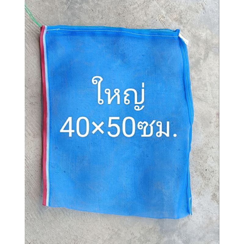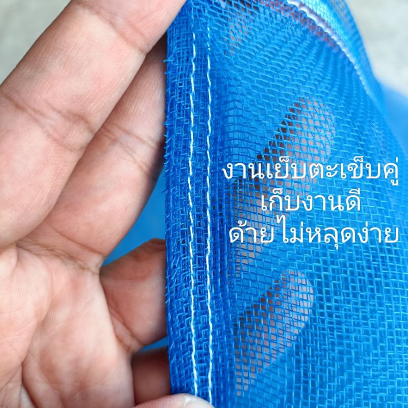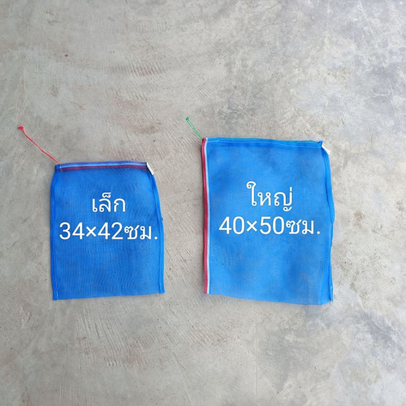 ถุงตาข่ายไนล่อน(สีฟ้า) (ใช้ห่อผลไม้กันแมลง ใส่ขวด ใส่ของ ใส่ปลา ใส่กบ เลี้ยงหอย มีเชือกรูดปากถุง มุ้งฟ้า)