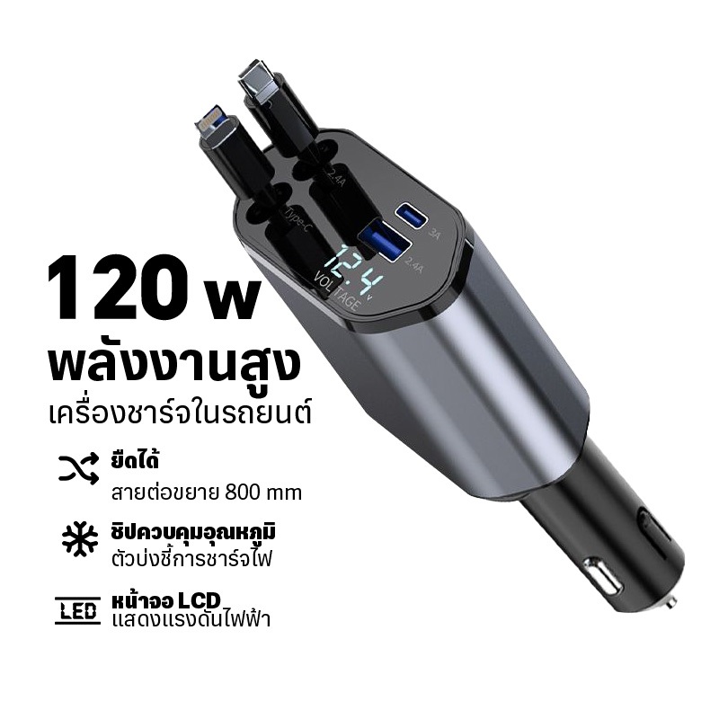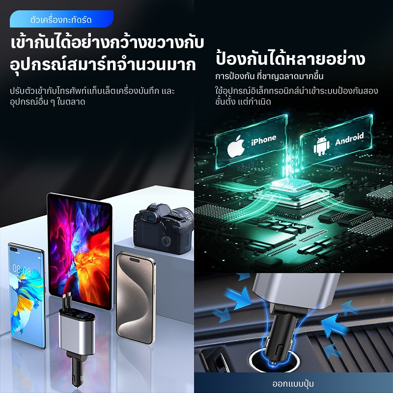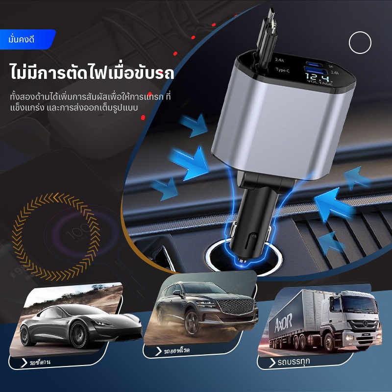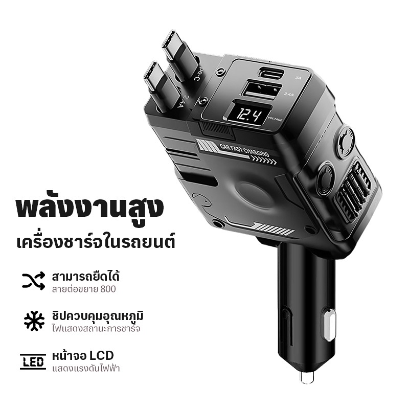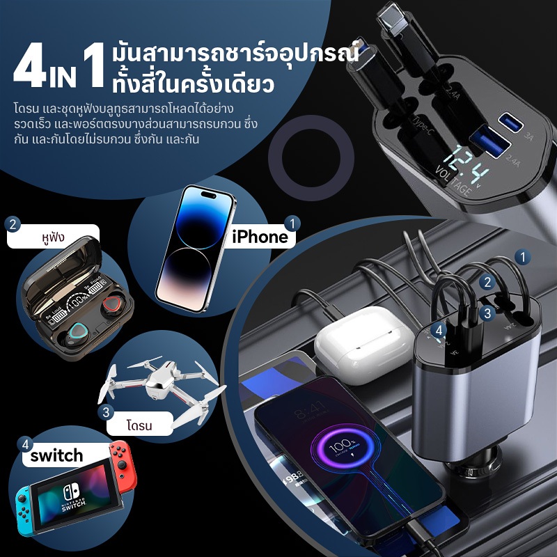 4 in 1 เครื่องชาร์จไฟในรถยนต์ แรงดันไฟฟ้าจอแสดงผลดิจิตอลอัจฉริยะมาพร้อมกับสายเคเบิลข้อมูลแบบยืดหดได้สนับสนุน IOS/Android