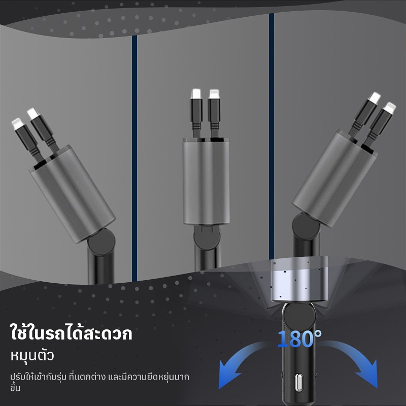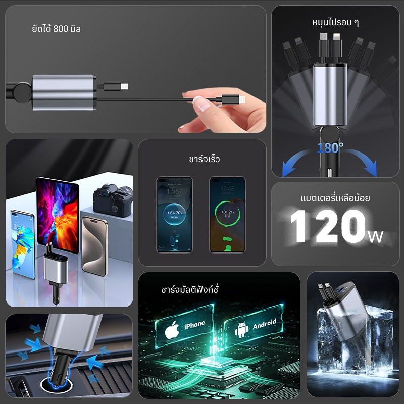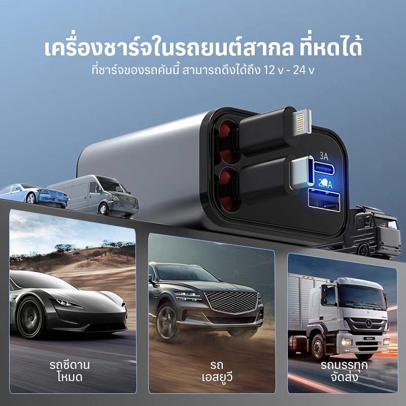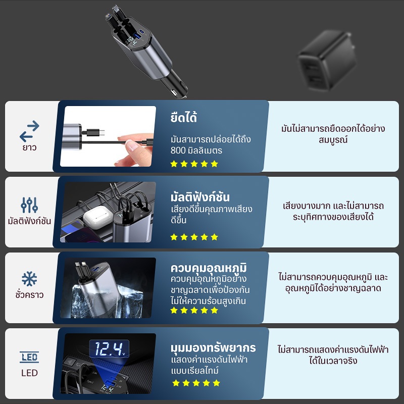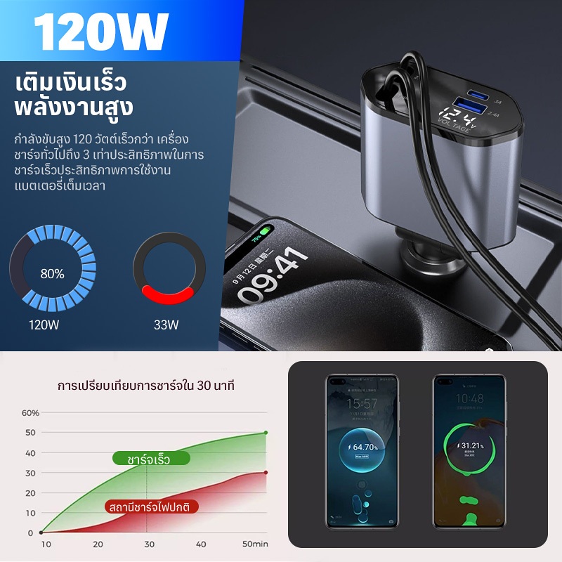 4 in 1 เครื่องชาร์จไฟในรถยนต์ แรงดันไฟฟ้าจอแสดงผลดิจิตอลอัจฉริยะมาพร้อมกับสายเคเบิลข้อมูลแบบยืดหดได้สนับสนุน IOS/Android