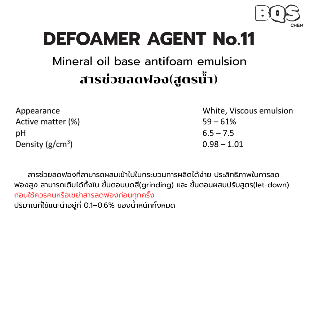 Defoamer No.11 สารลดฟองสูตรน้ำ สำหรับสี กาว เคมีสูตรน้ำ | Mineral Oil Base Antifoam Emulsion