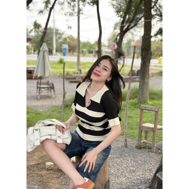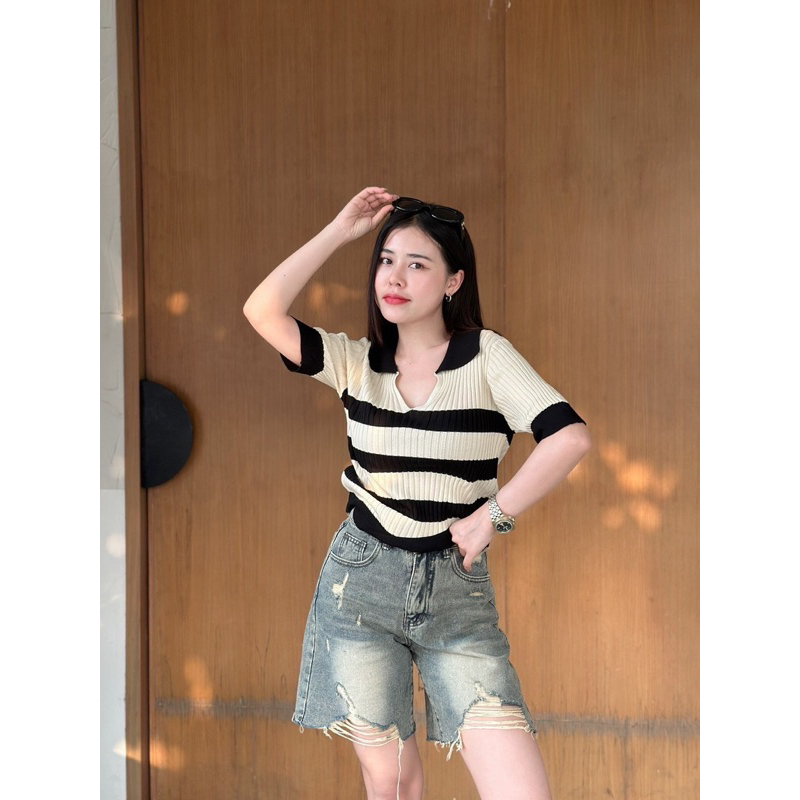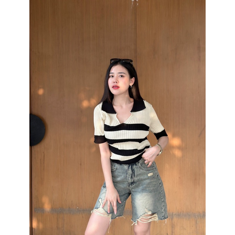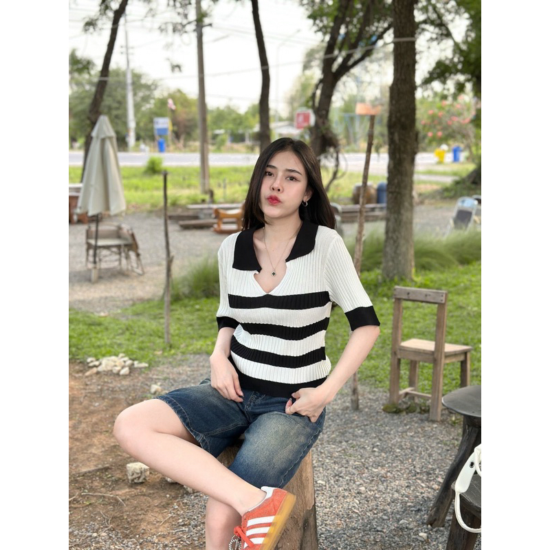 Dzaishop💕เสื้อโปโลคอวีแขนสั้น🌹ทอลายตัดสีมาแบบปังๆ ใส่คู่กับอะไรก็เริ่ด
