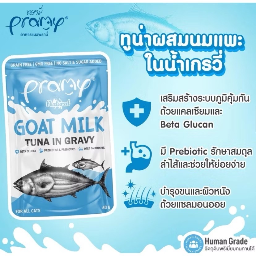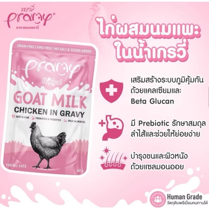 ( 12 ซอง )Pramy Goat Milk in Gravy อาหารเปียกแมวผสมนมแพะในน้ำเกรวี ไม่เติมเกลือ ขนาด 60 กรัม(12 ซอง)