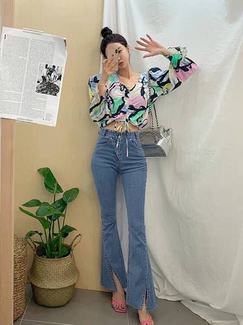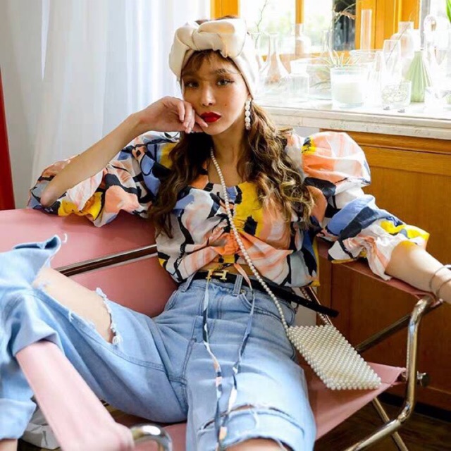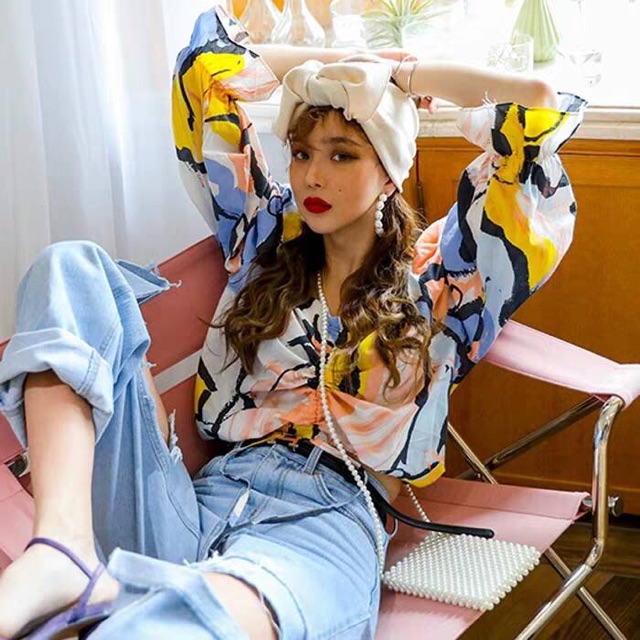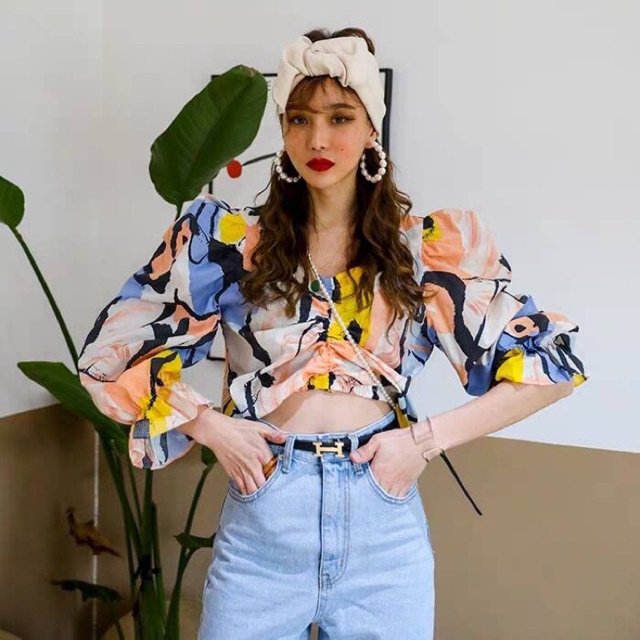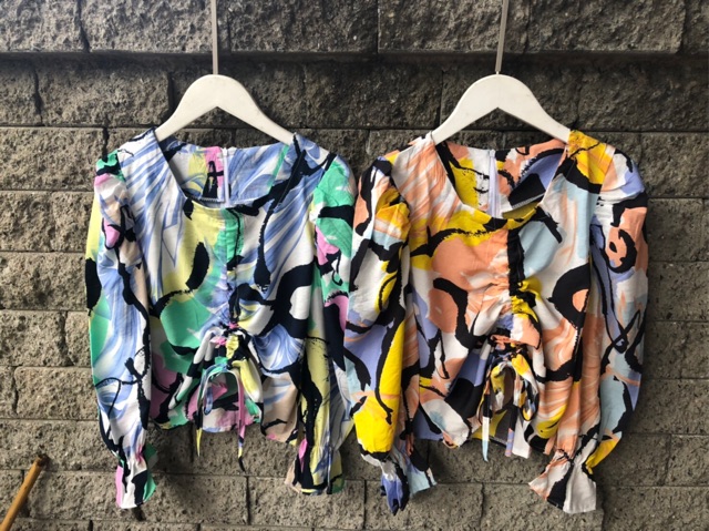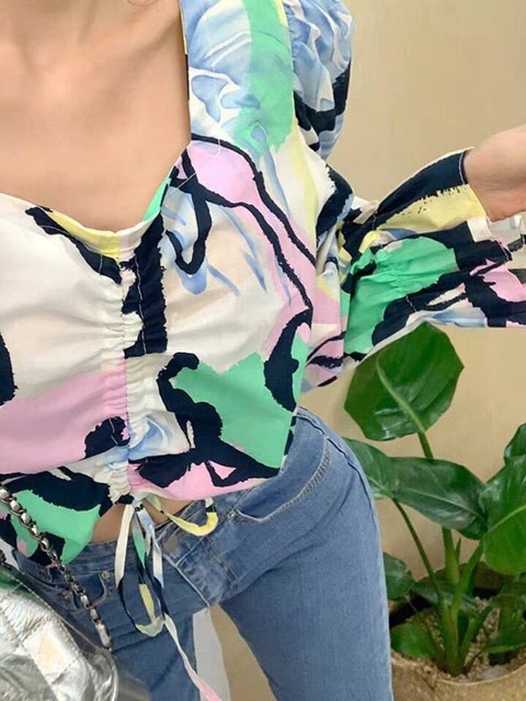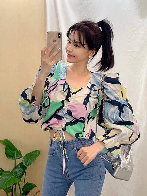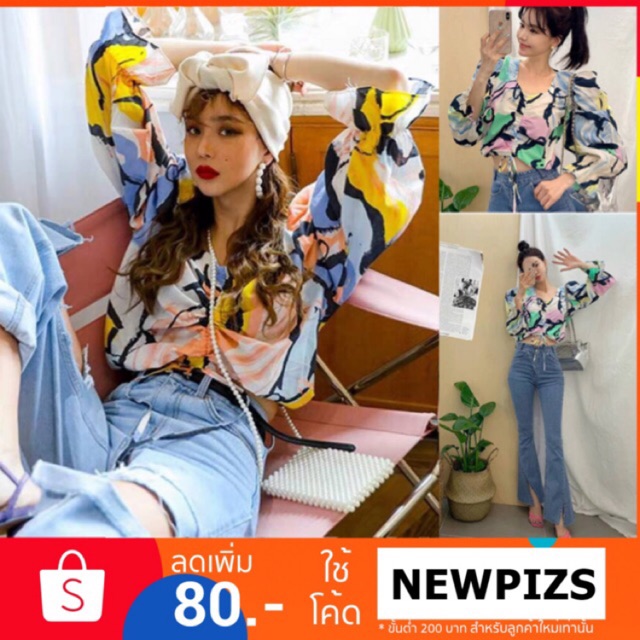 เสื้อแขนพองลายกราฟฟิกรูดด้านหน้า