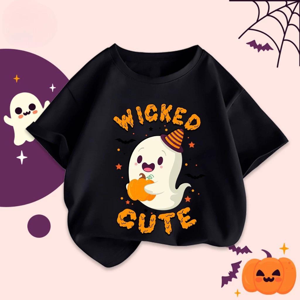 เสื้อผู้หญิง ที่ไม่ซ้ํากันฮาโลวีนกราฟิกเสื้อยืดสําหรับเด็กผู้ใหญ่น่ารักผีฟักทองพิมพ์ผ้าฝ้ายเสื้อยืดพรรคคอสเพลย์เครื่องแต่งกายท็อปส์
