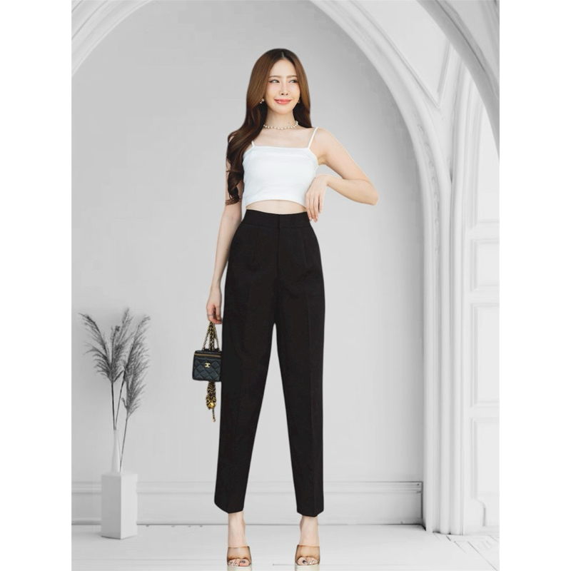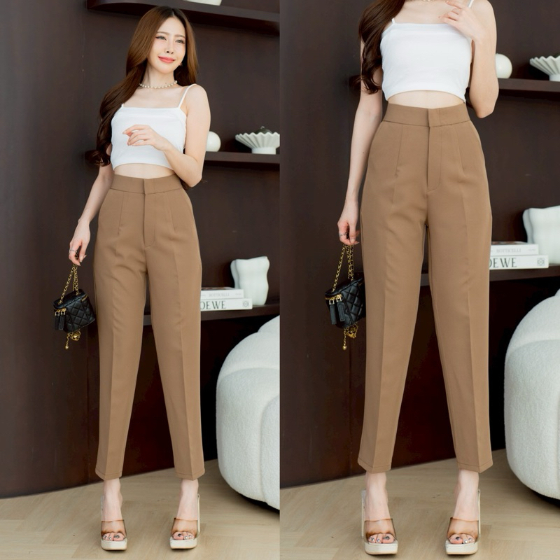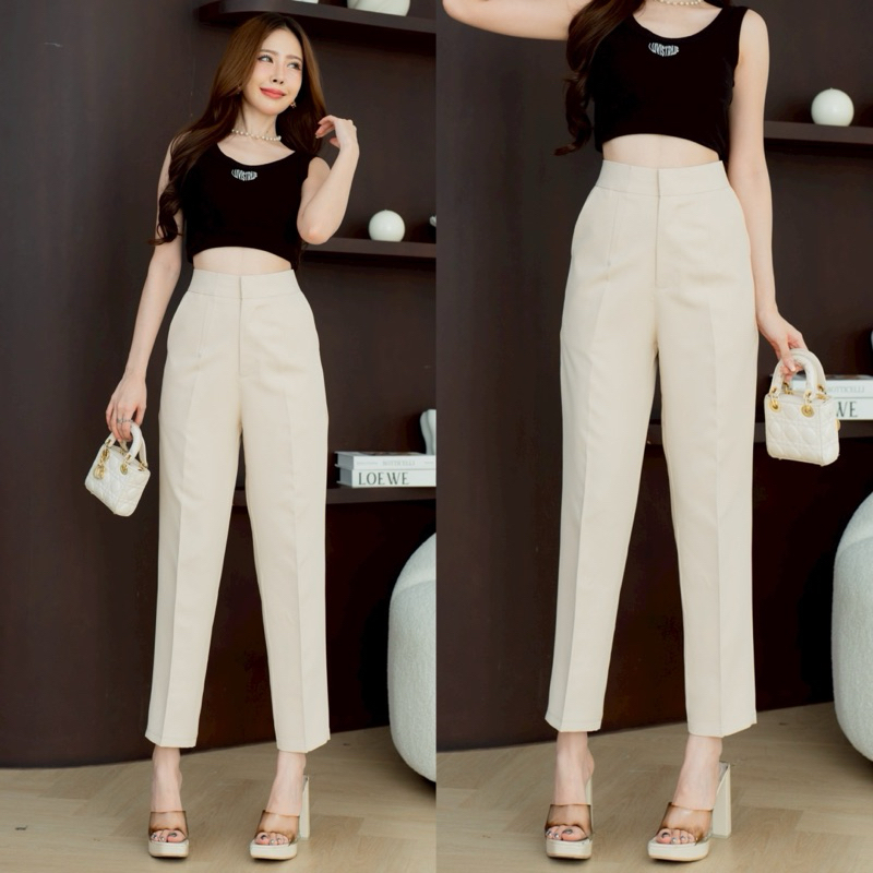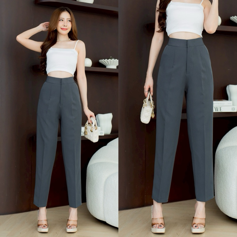 กางเกงทำงานทรงขากระบอกเล็กตะขอหน้าเอวสูง 9 ส่วน ผ้าไมโคร [ AC ]