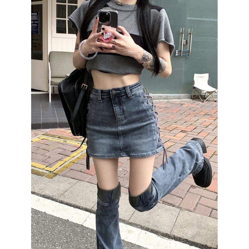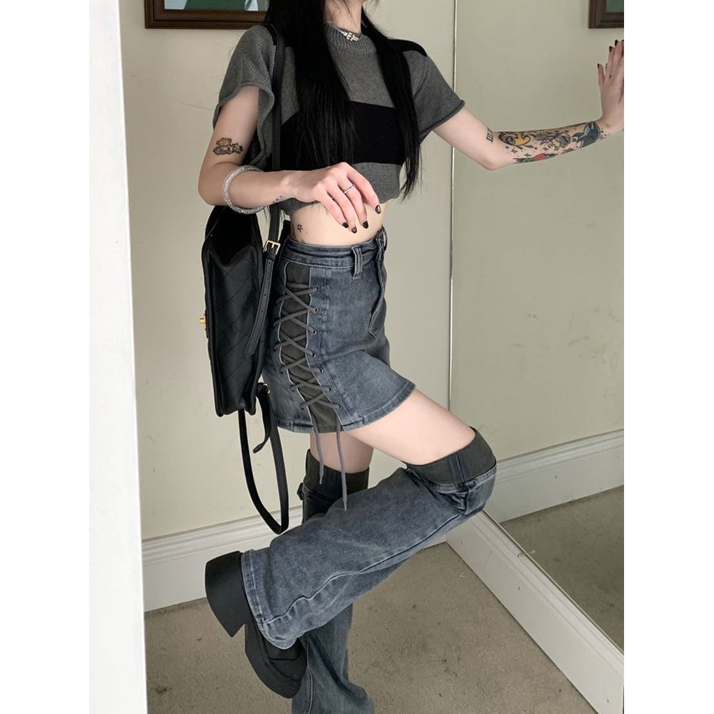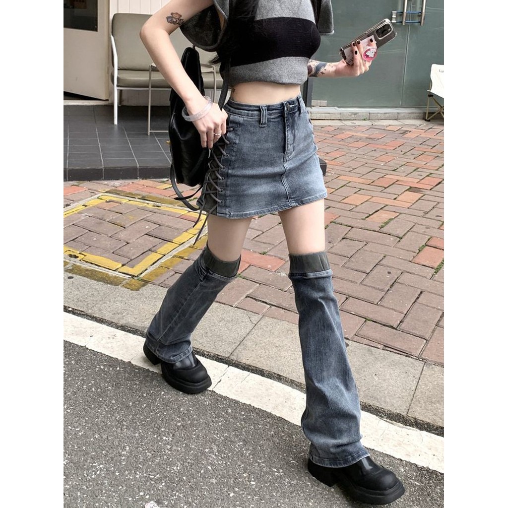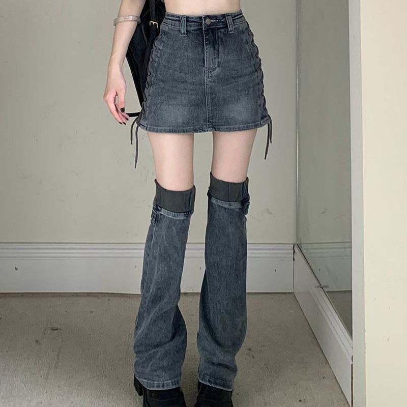 Hot Girl+Sock Set Hip Design Women's Skirt Split Calf Denim Skirt High Waist Leg Warmer Two-in-One Drawstring a Words