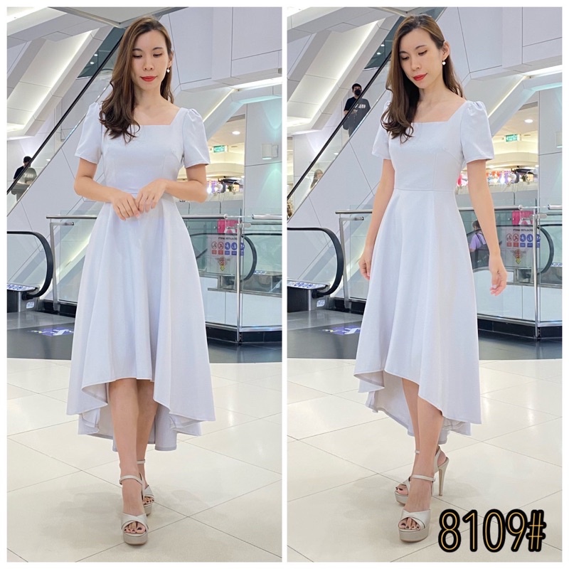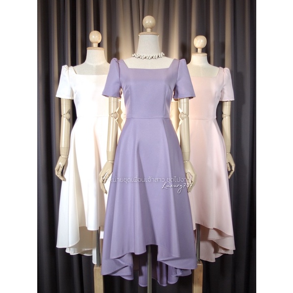 FN8109 Midi dress คอเหลี่ยม กระโปรงหน้าสั้นหลังยาวมี สีม่วง ชุดไปงานแต่ง ชุดออกงาน เดรสเพื่อนเจ้าสาว [LUXURY707]