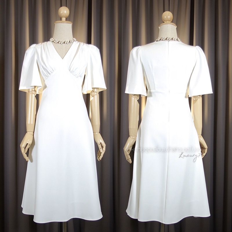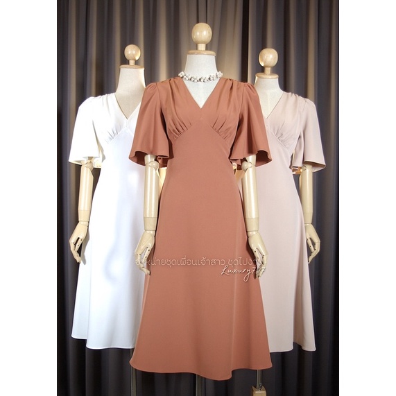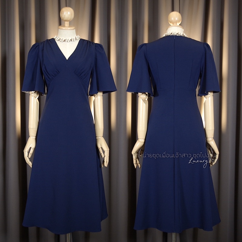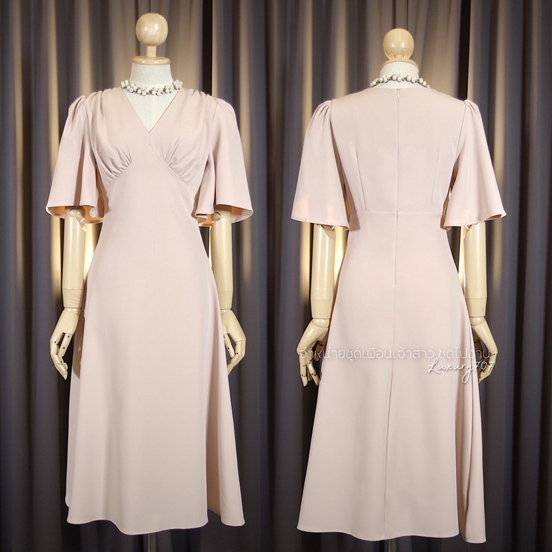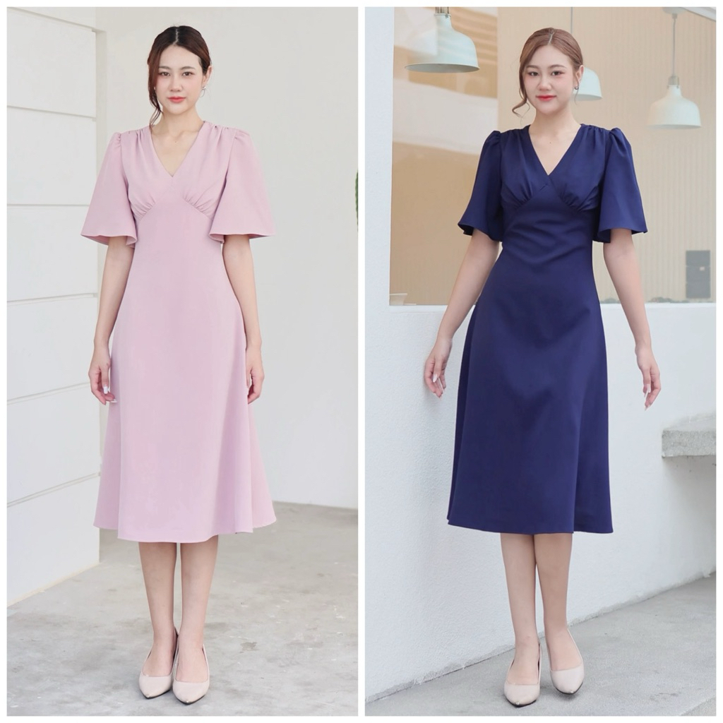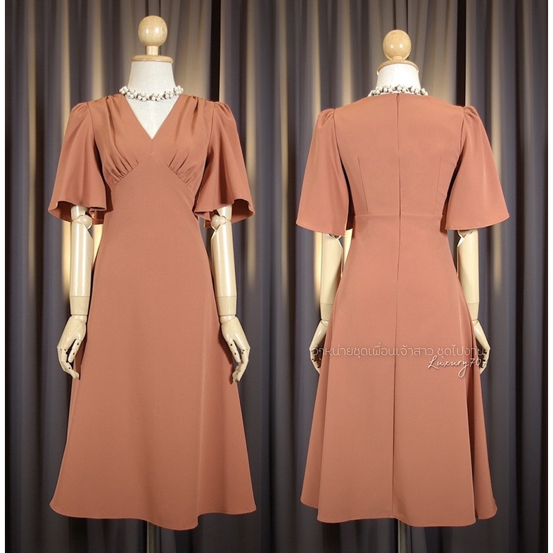 FN8107 Midi dress คอวี แขนกระดิ่ง ชุดไปงานแต่ง ชุดออกงาน เดรสเพื่อนเจ้าสาว [LUXURY707]