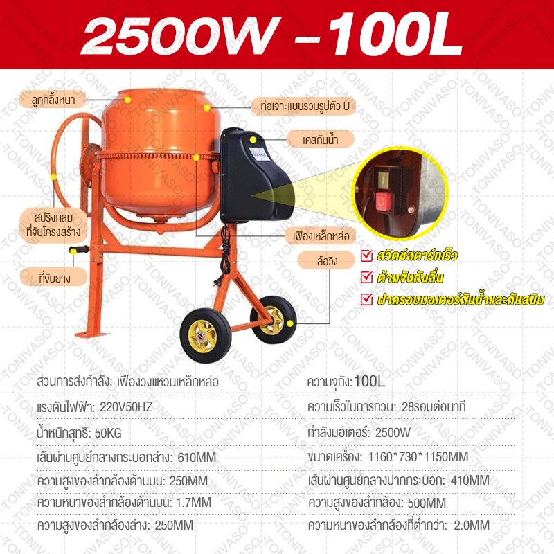 โม่ผสมปูนคอนกรีต 240ลิตร ใช้งานได้สะดวกและง่ายต่อการเคลื่อนย้าย มีมอเตอ มอเตอร์พันด้วยทองแดง 100% เสียงเบา แข็งแรง ทนทาน