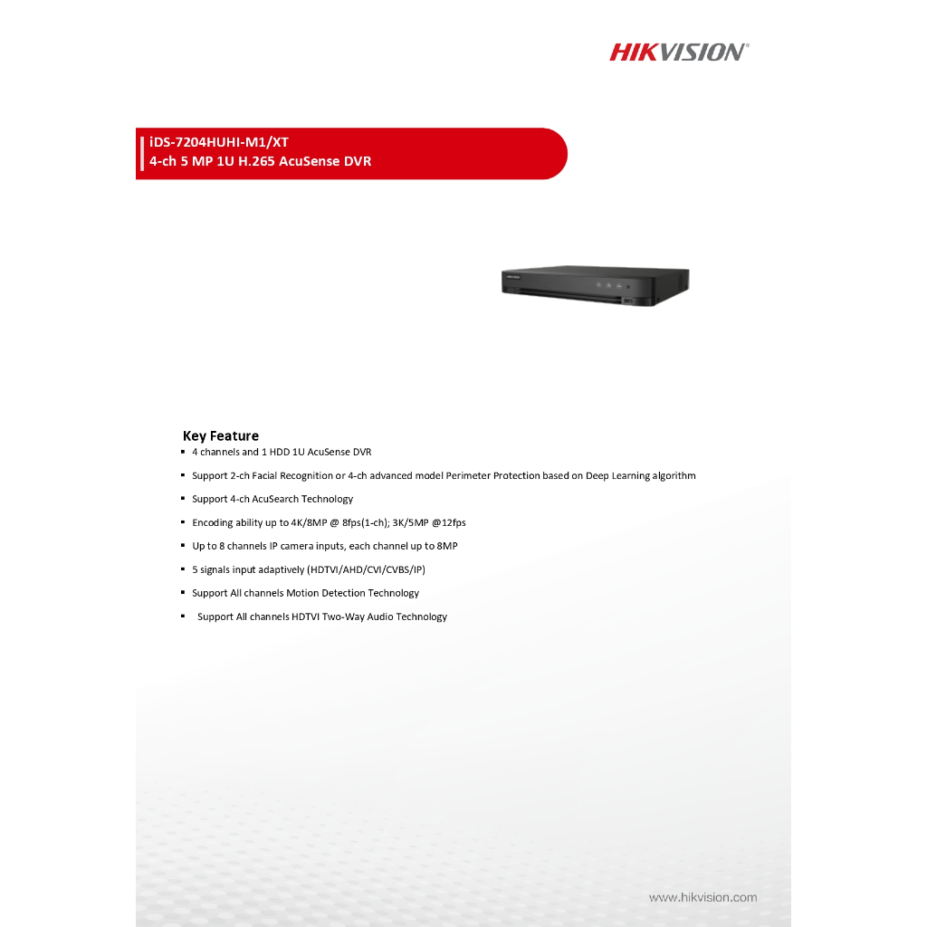HIKVISION กล้องวงจรปิด 5MP มีไมค์ iDS-7204HUHI-M1/XT + DS-2CE16K0T-LFS 2.8mm 4 ตัว + ชุดอุปกรณ์