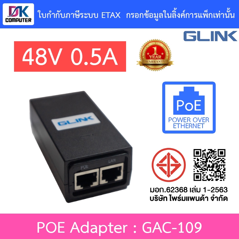 Glink Adapter POE 10/100Mbps 48V - 0.5A อุปกรณ์จ่ายไฟฟ้าผ่านสายแลน รุ่น GAC-109