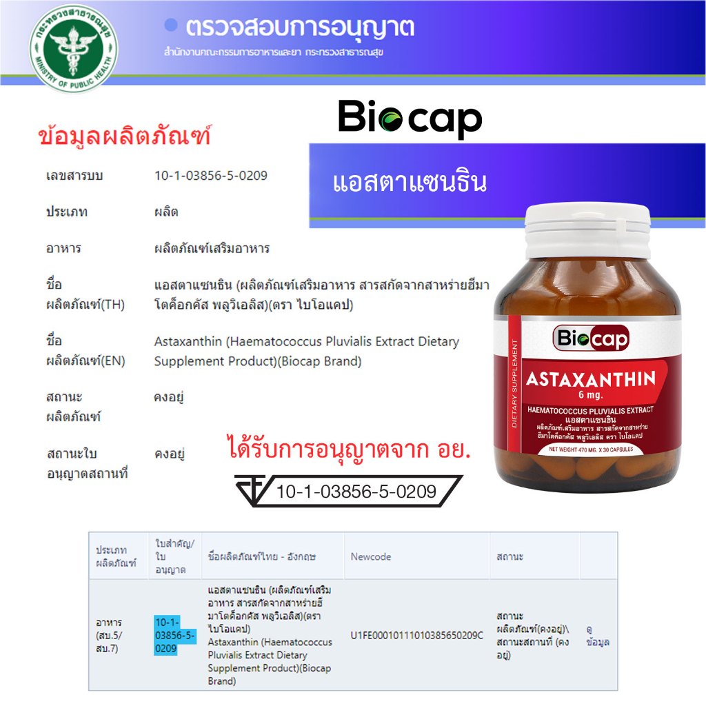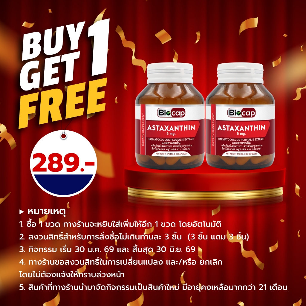 [ซื้อ 1 แถม 1] แอสตาแซนธิน 6 mg. Astaxanthin Biocap ไบโอแคป แอสต้าแซนทีน จากสารสกัดจากฮีมาโตค็อกคัส