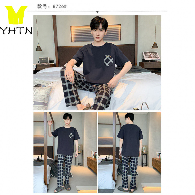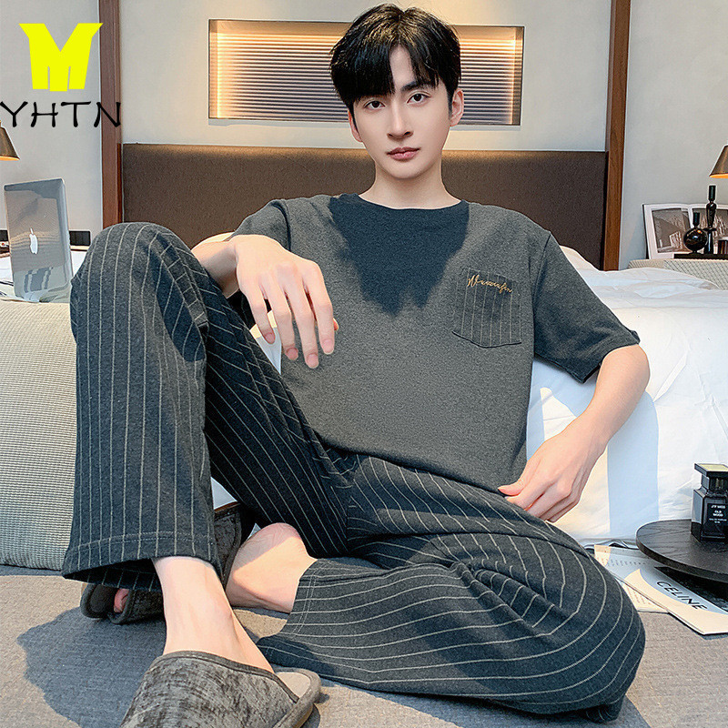 YHTN ชุดนอนผู้ชายผ้าฝ้ายแขนสั้นกางเกงขายาวรอบคอหัวเสื้อนอกสวมใส่ชุดโฮมสูทชายผ้าฝ้ายระบายอากาศได้