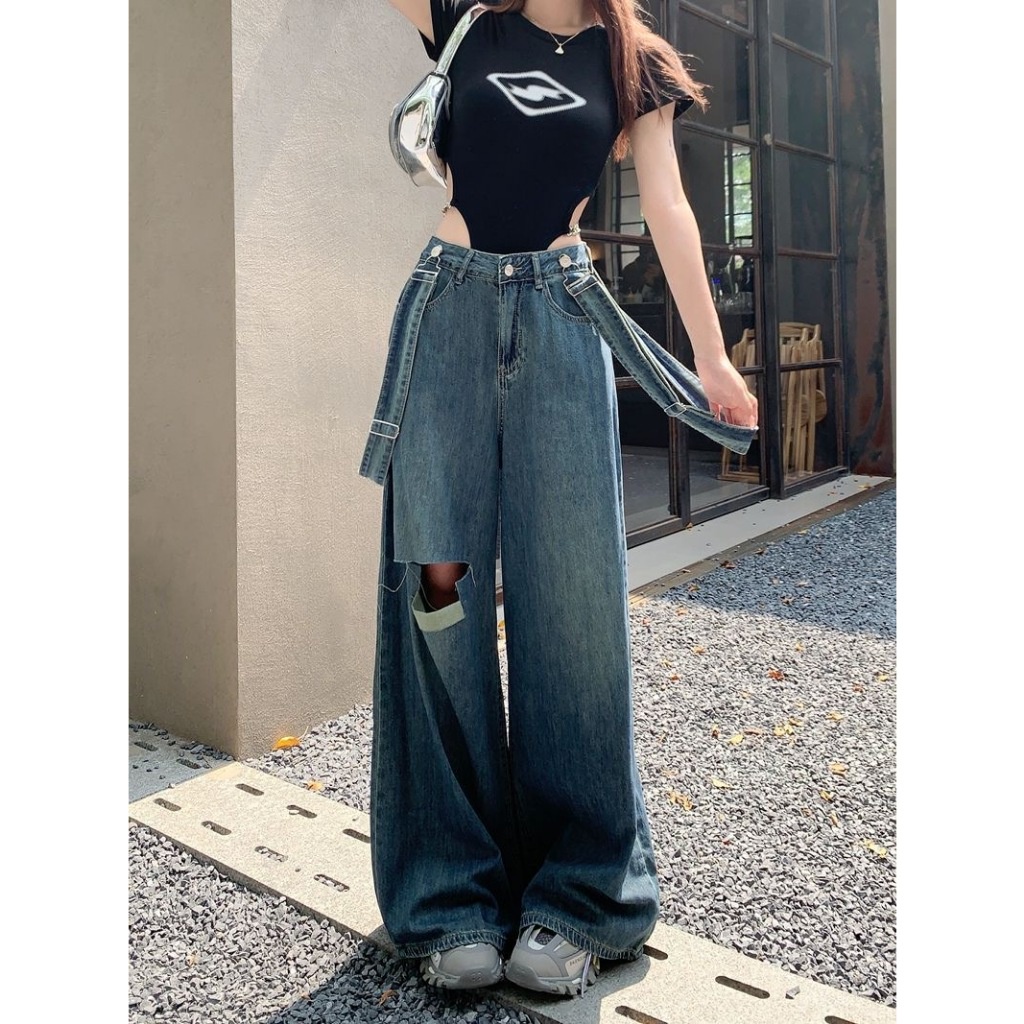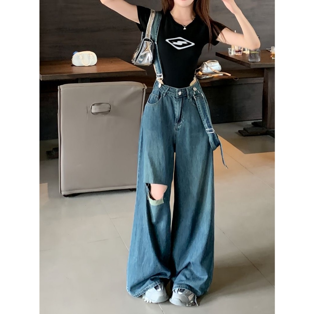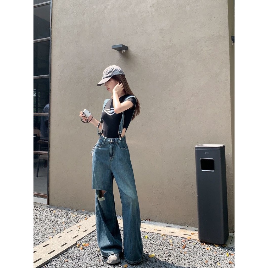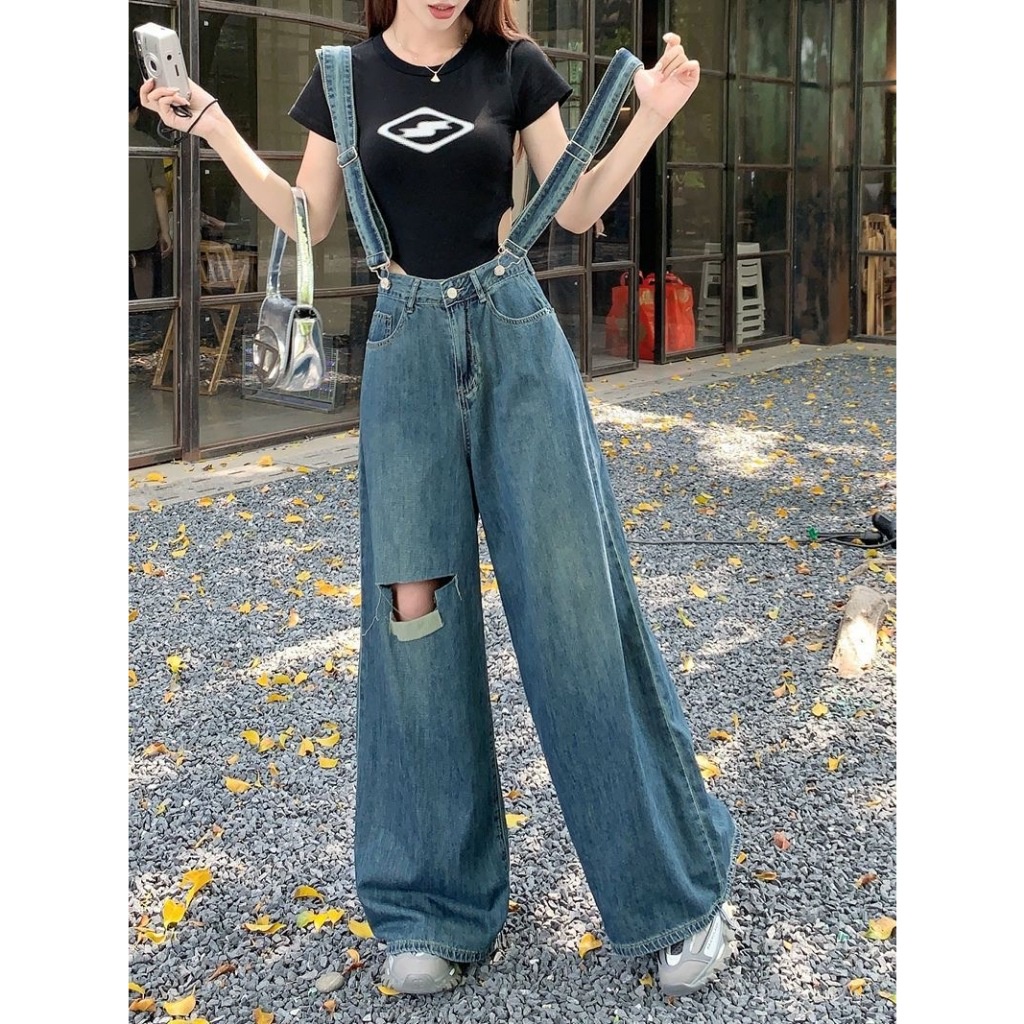 CLOTHING กางเกงยีนส์เอี๊ยมขายาวเเต่งขาดผู้หญิง รุ่น W9712