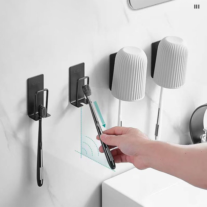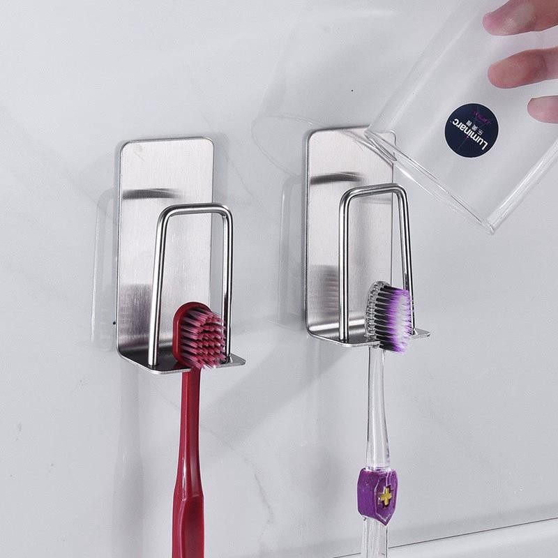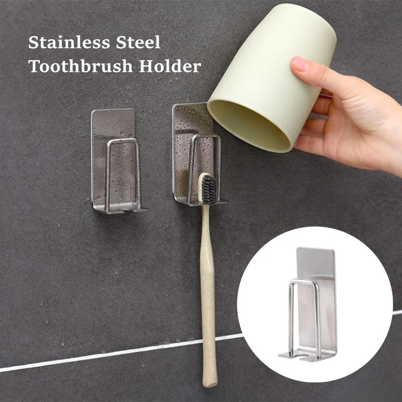 2 ใน 1 สแตนเลสผู้ถือแปรงสีฟัน ตัวเอง-กาว ติดผนังน้ํายาบ้วนปากถ้วยชั้นเก็บประหยัดพื้นที่ห้องน้ําออแกไนเซอร์ตะขอ