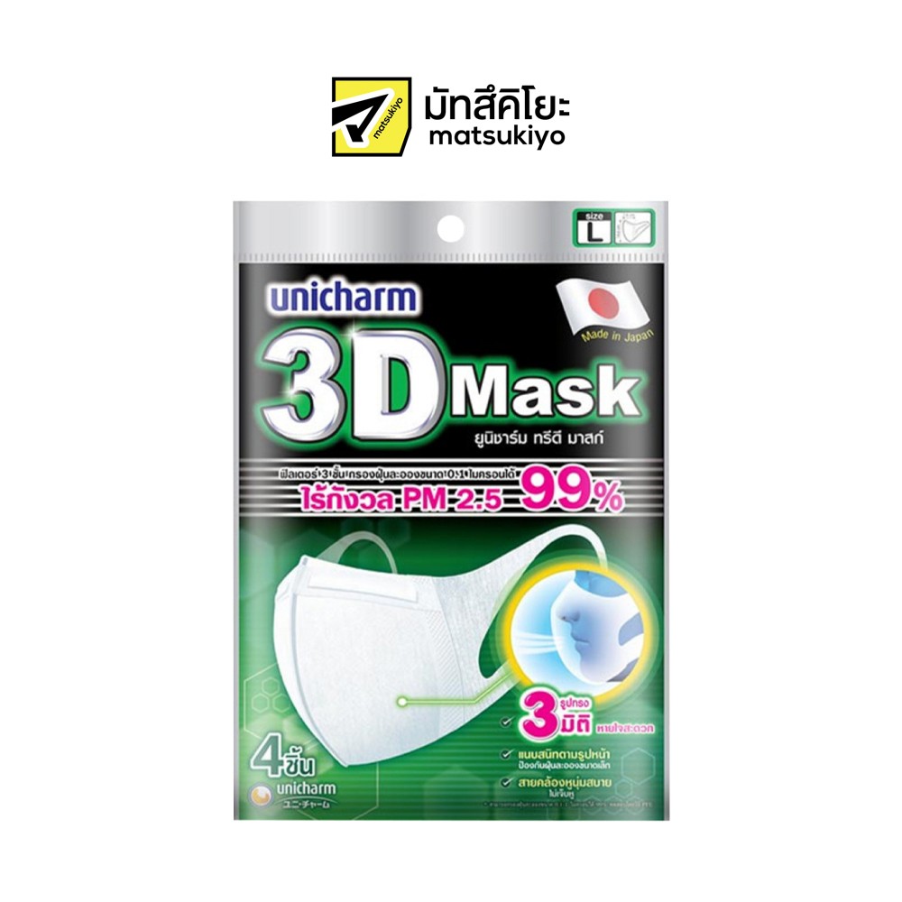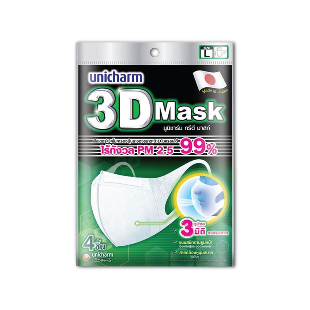 Unicharm 3D Mask Adult Size L 4pcs. ยูนิชาร์มทรีดีหน้ากากอนามัยสำหรับผู้ใหญ่ขนาดเเอล 4ชิ้น