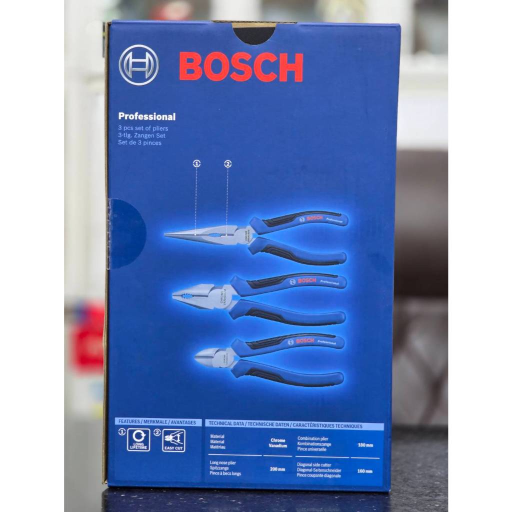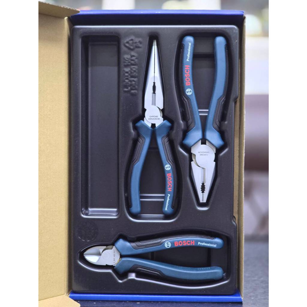 BOSCH ชุดคีม 3 ชิ้น คีมปากจิ้งจก 7 นิ้ว, คีมปลายแหลม 8 นิ้ว, คีมปากเฉียง 6.5 นิ้ว รหัสสินค้า 1 600 A01 6BG