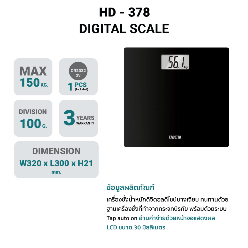 TANITA เครื่องชั่งน้ำหนักบุคคลแบบดิจิทัล รุ่น HD-378 สีดำ