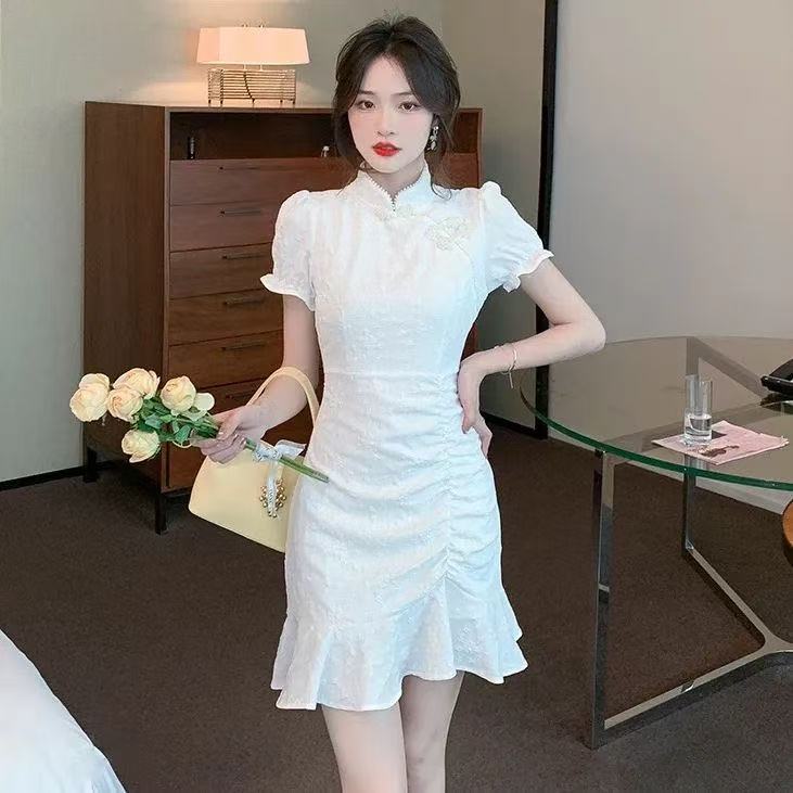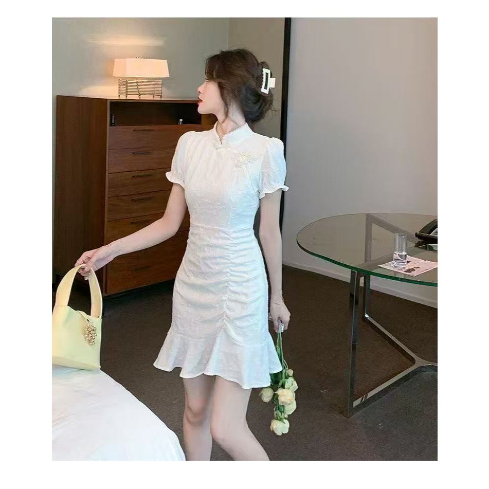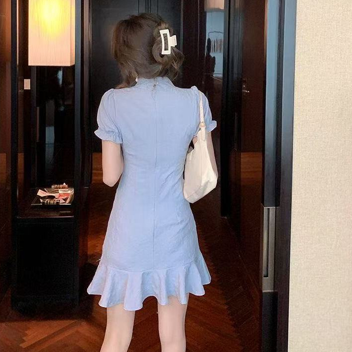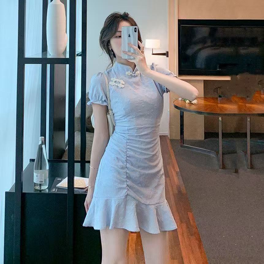แฟชั่นสไตล์ใหม่สีทึบสไตล์จีนหัวเข็มขัดเย็บปักถักร้อยชุดกี่เพ้า