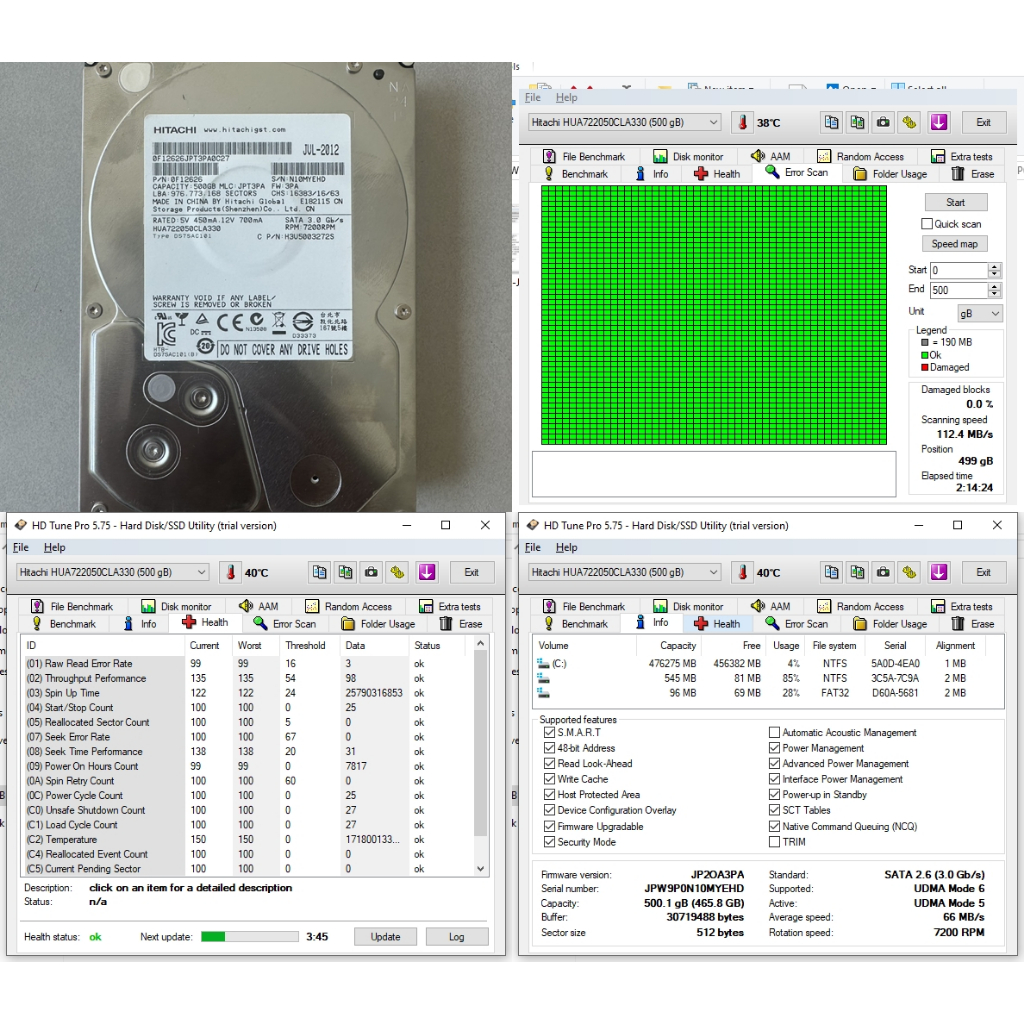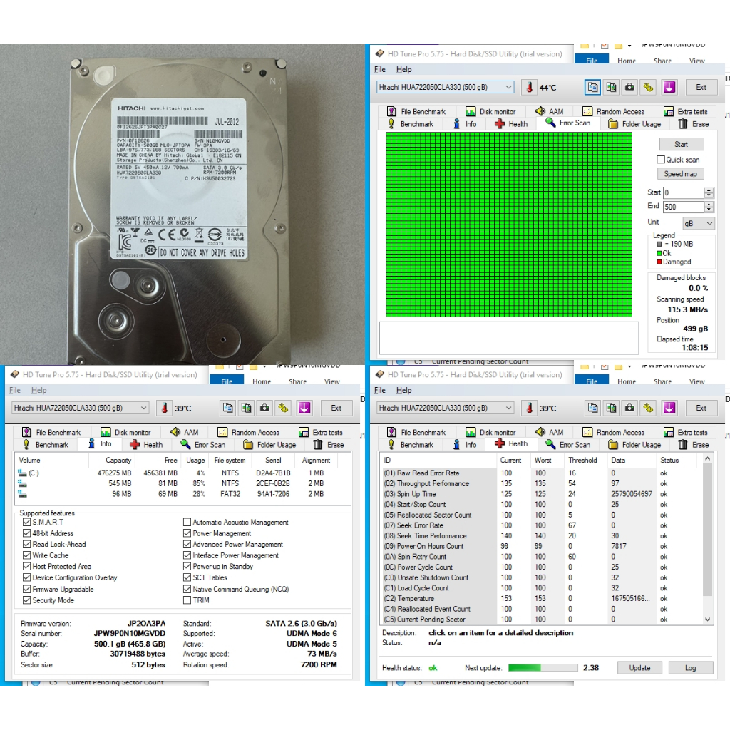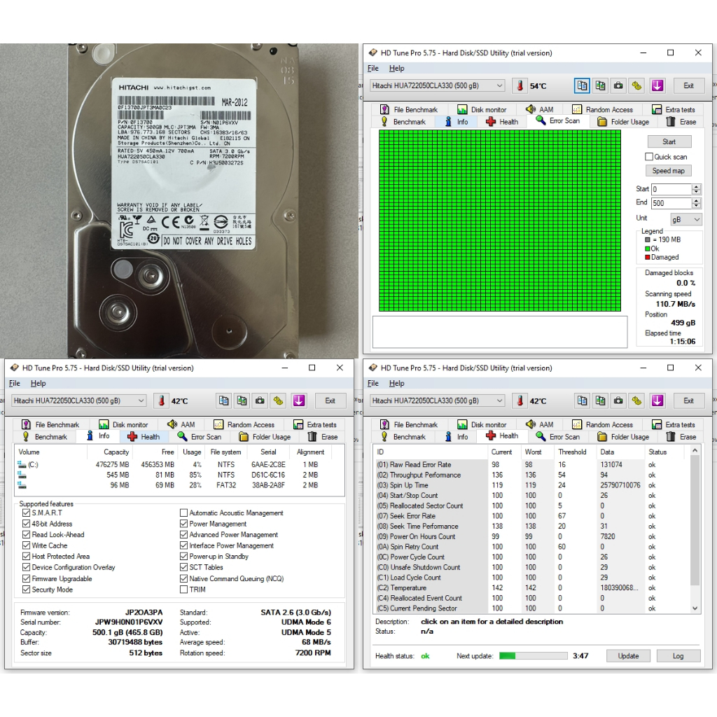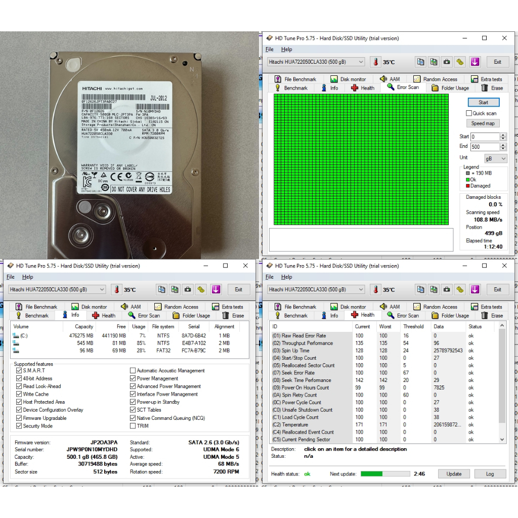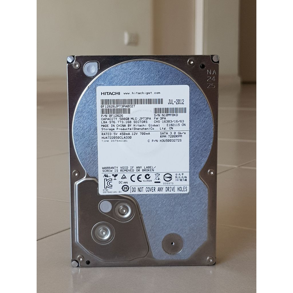 ฮาร์ดดิสก์ Hard Disk HDD ขนาด 3.5" ความจุ 500GB Hitachi HUA722050CLA330 รอบจานหมุน 7200 RPM (7.2K) มีผลทดสอบจริงทุกตัว
