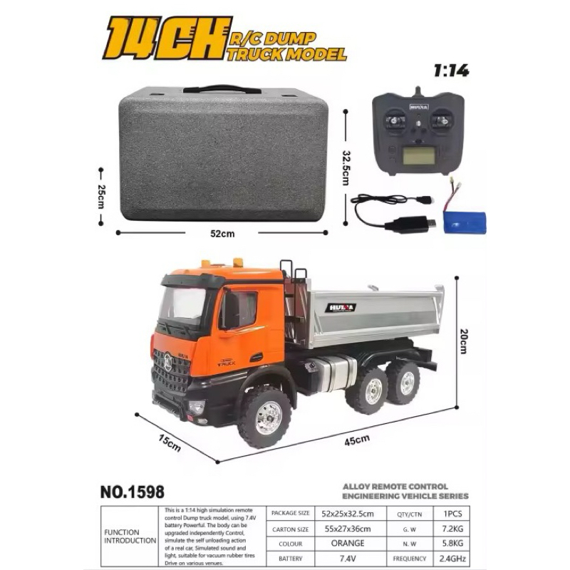 รถดั้มบังคับวิทยุHuina1598 6X6WD 14CH สเกล1:14 รีโมท2.4GHz มีเสียงและมีไฟแบตเตอรี่ชาร์จอุปกรณ์พร้อมเล่น