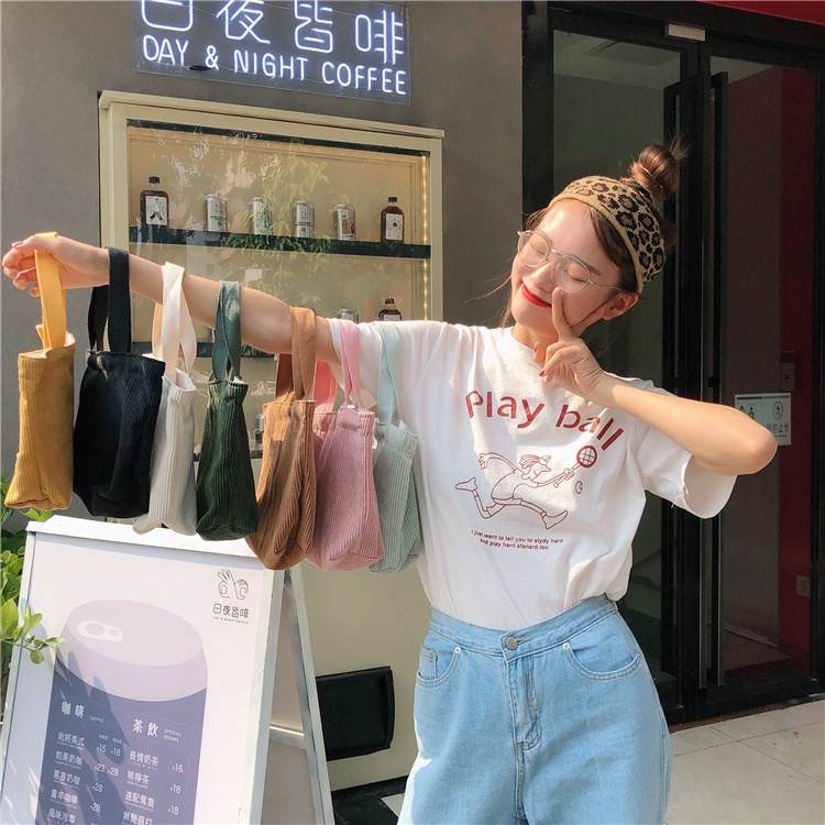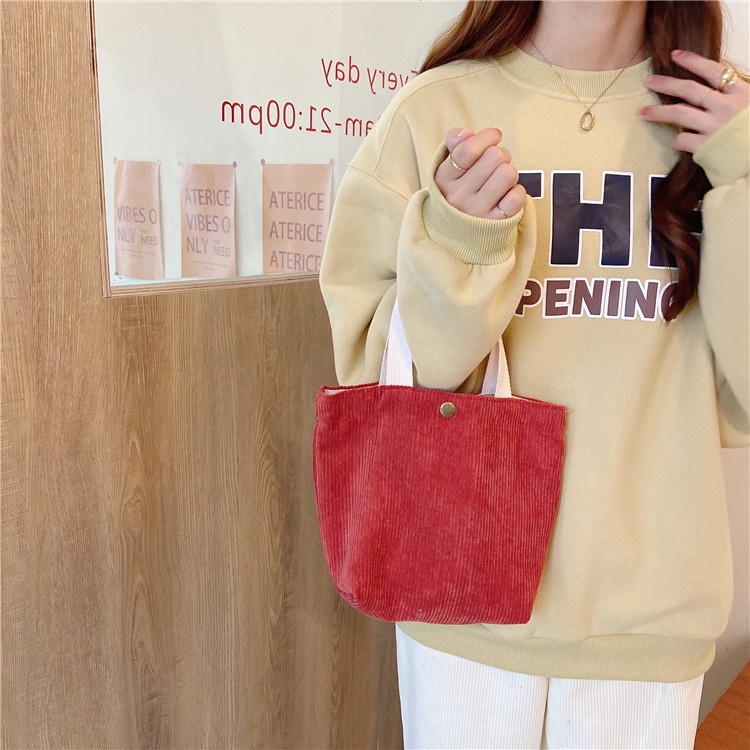 กระเป๋าถือ ผ้าแคนวาส ผ้าลูกฟูก ขนาดเล็ก แบบพกพา สีชมพู สีพื้น สําหรับใส่ขวดน้ํา อาหารกลางวัน