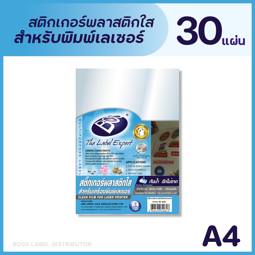 BOS สติกเกอร์พลาสติกใสสำหรับพิมพ์เลเซอร์ A4 (แพ็ค 30 แผ่น) CLEAR FILM STICKER FOR LASER PRINTER