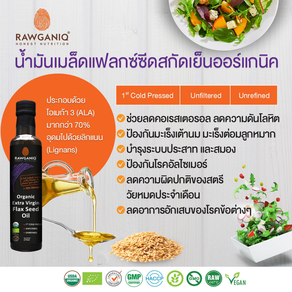 น้ำมันเมล็ดแฟลกซ์ซีดสกัดเย็นออร์แกนิค ไม่ผ่านกรรมวิธี ไม่กรอง 275 มล.Organic Extra Virgin Golden Flaxseed Oil
