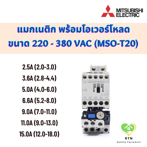 Mitsubishi แมกเนติก พร้อมโอเวอร์โหลด แรงดัน 220VAC - 380VAC ขนาด 2.5A, 3.6A, 5A, 6.6A, 9A, 11A ,15A รุ่น MSO-T20