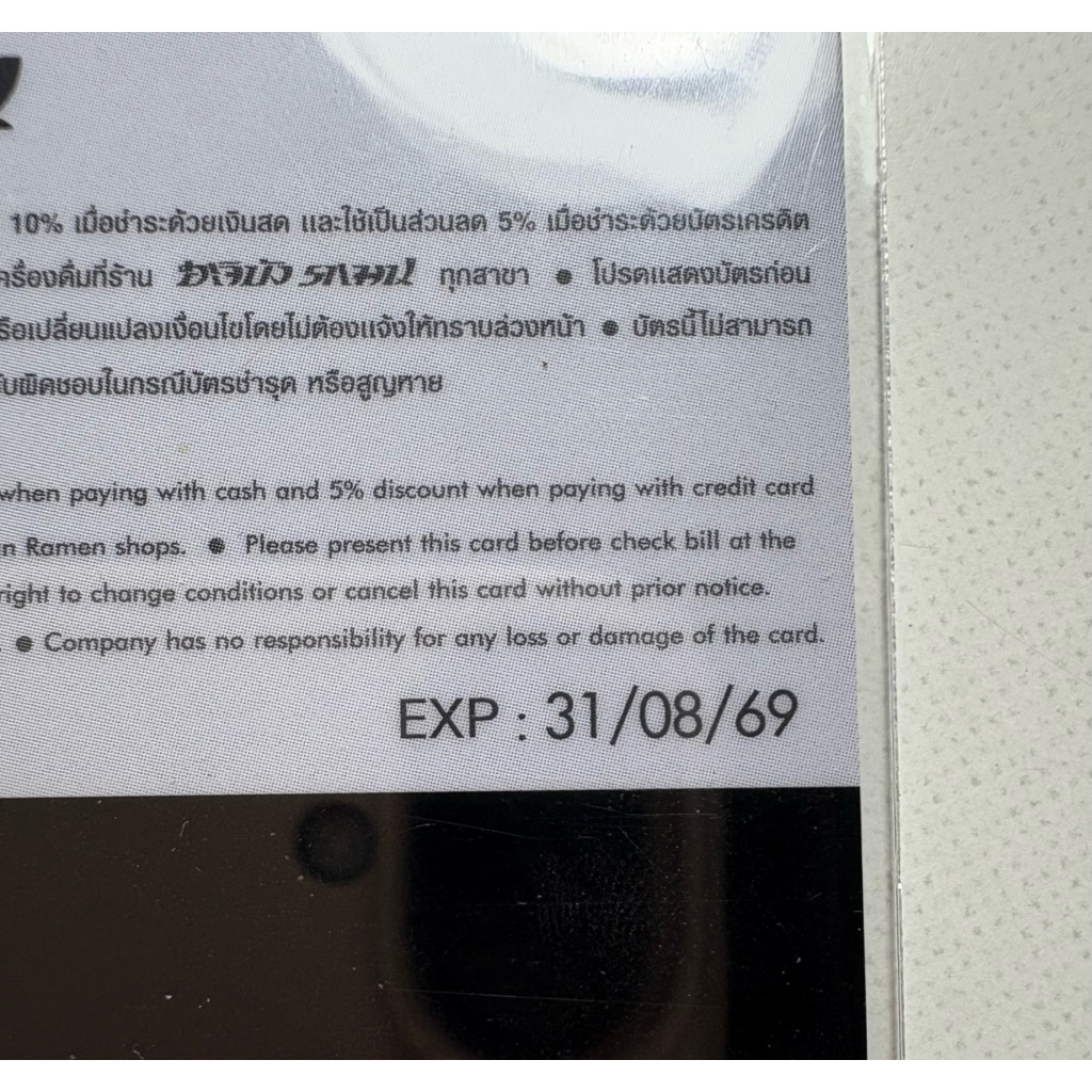 บัตรสมาชิก ฮะจิบัง ราเมน Hachiban Ramen หมดอายุ 31 ส.ค. 69 ฮาจิบัง สะสม
