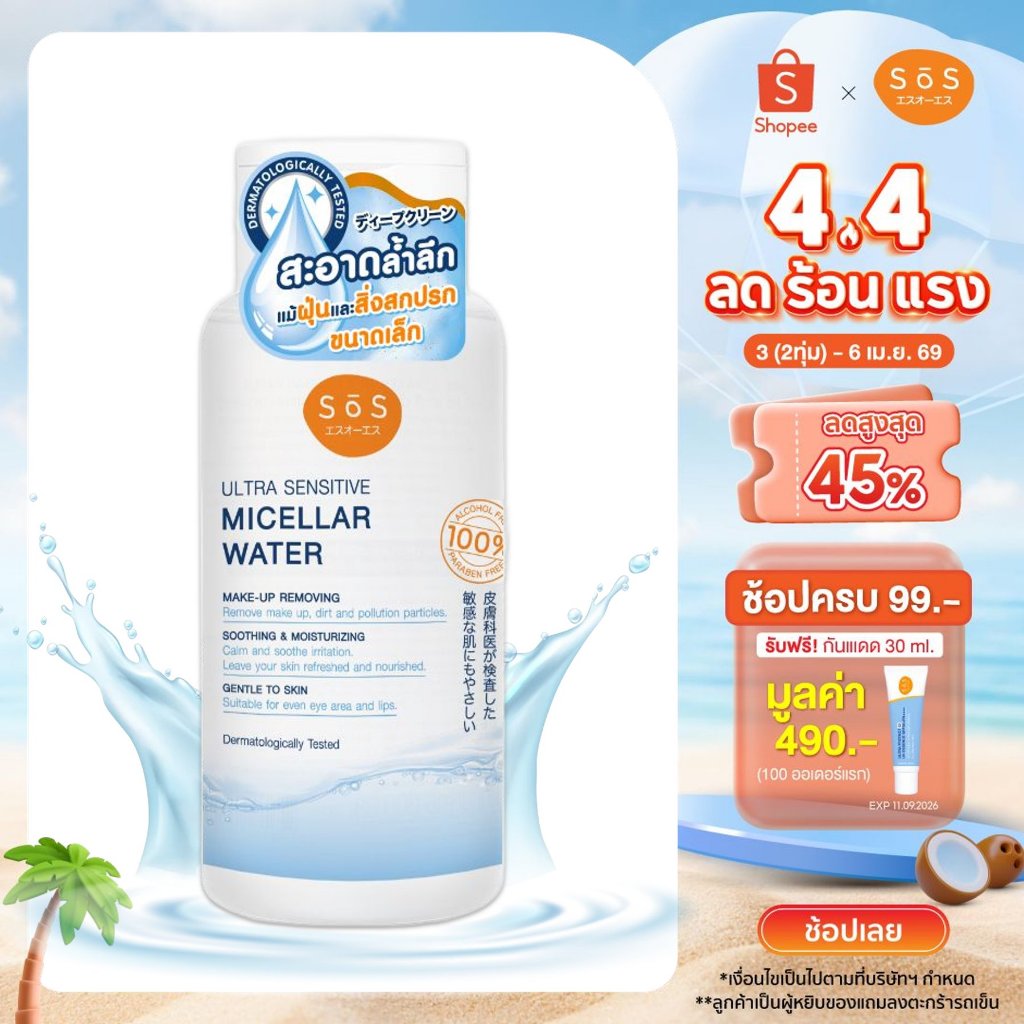 SOS ULTRA SENSITIVE MICELLAR WATER 300 ML คลีนซิ่งเคลียร์ผิว เคลียร์ได้สะอาดหมดจด แม้ฝุ่นละอองขนาดเล็ก (10SO00091)