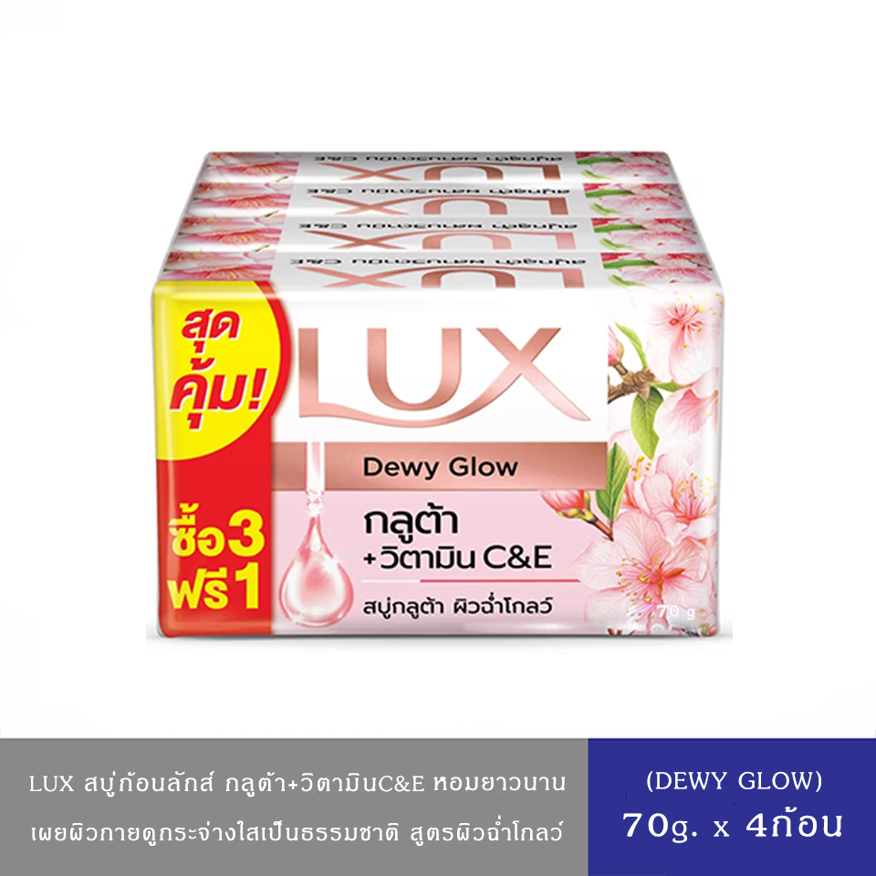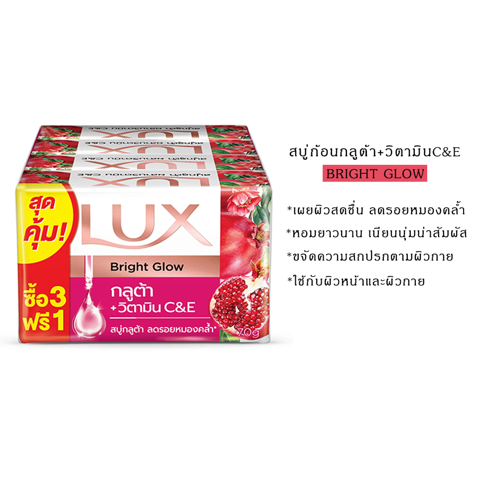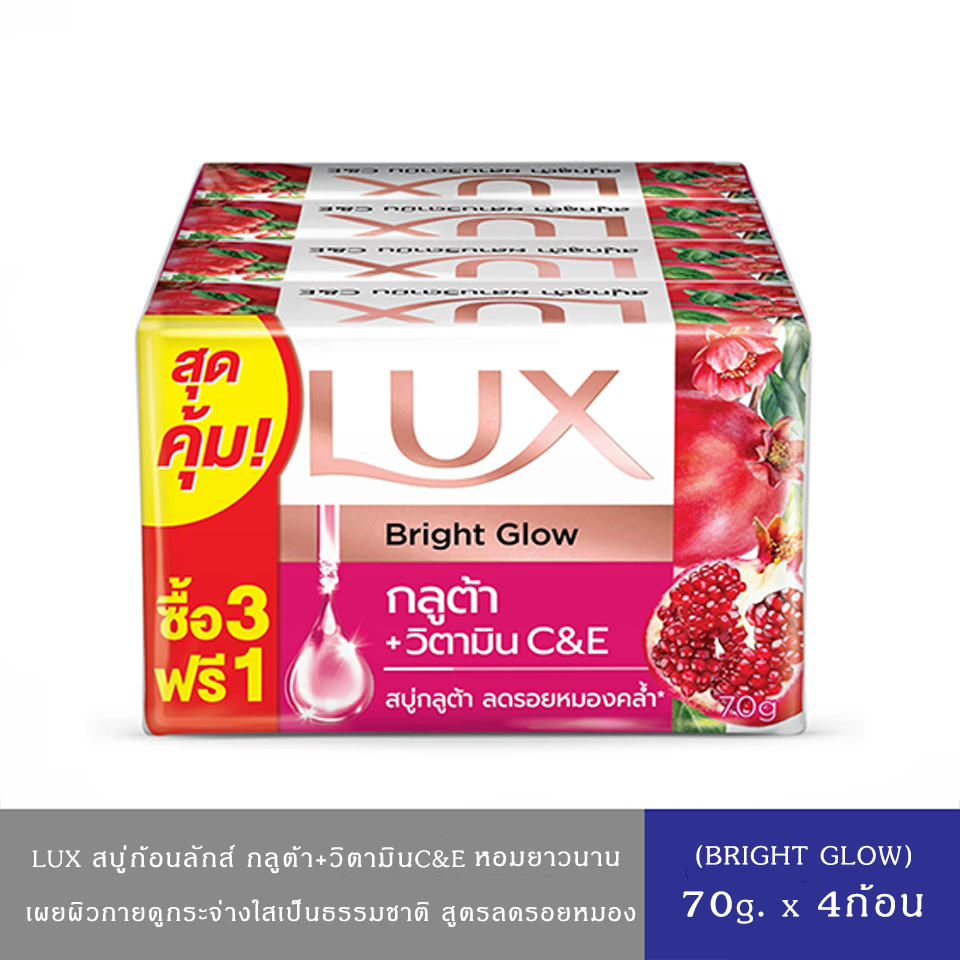 (มีให้เลือก 4 สูตร)LUX ลักส์ สบู่อาบน้ำ กลูต้า+วิตามินC&E 70ก.*แพ็ค 4ก้อน ลักส์ สบู่กลูต้าวิตามิน ไบร์ทโกลว์ ทับทิม 70ก.