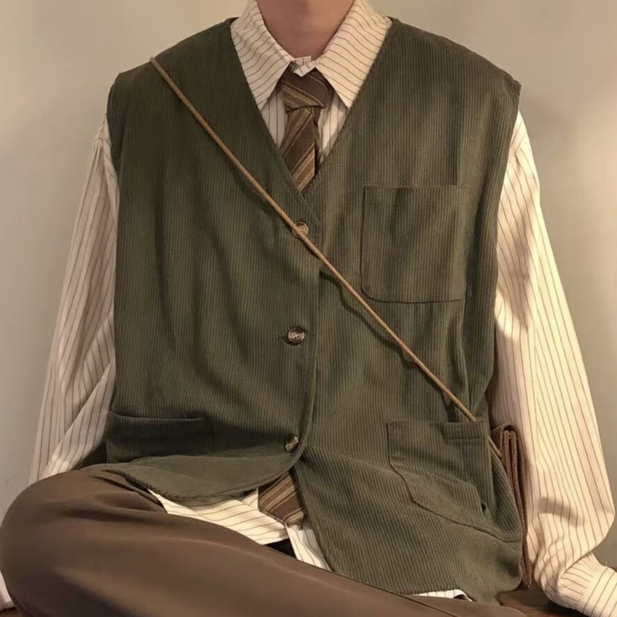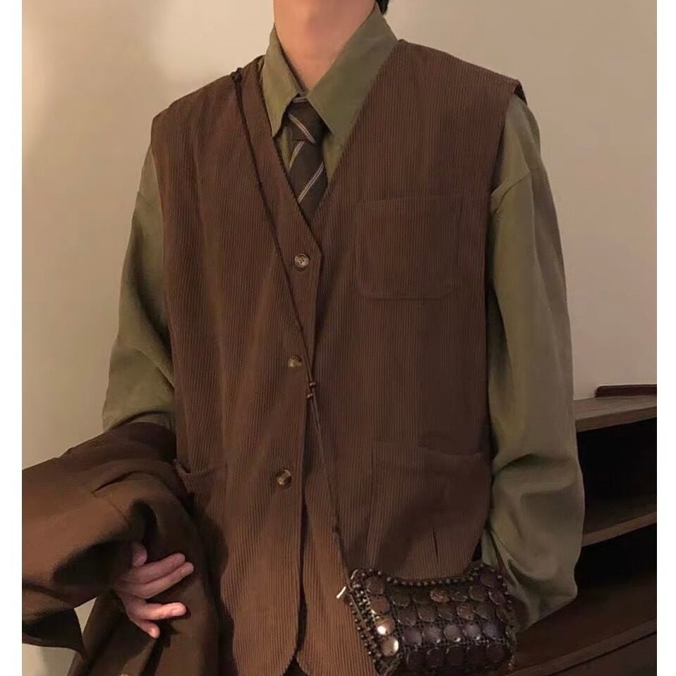 ผ้าลูกฟูก เสื้อกั๊กหลวมเสื้อกั๊กผู้ชายฤดูใบไม้ร่วงญี่ปุ่นย้อนยุคเสื้อกั๊กถนนสวมใส่สบายๆ คนพาล หล่อแจ็คเก็ตแขนกุดผู้ชาย