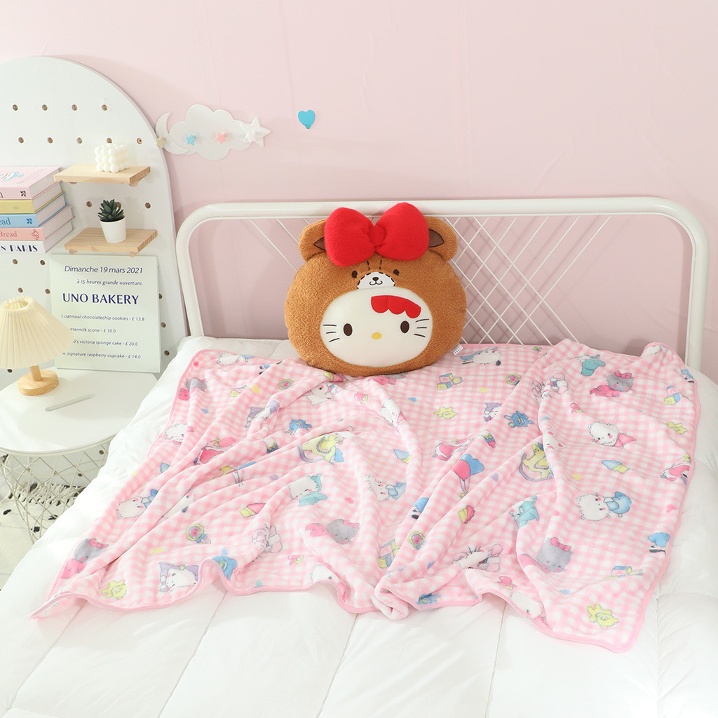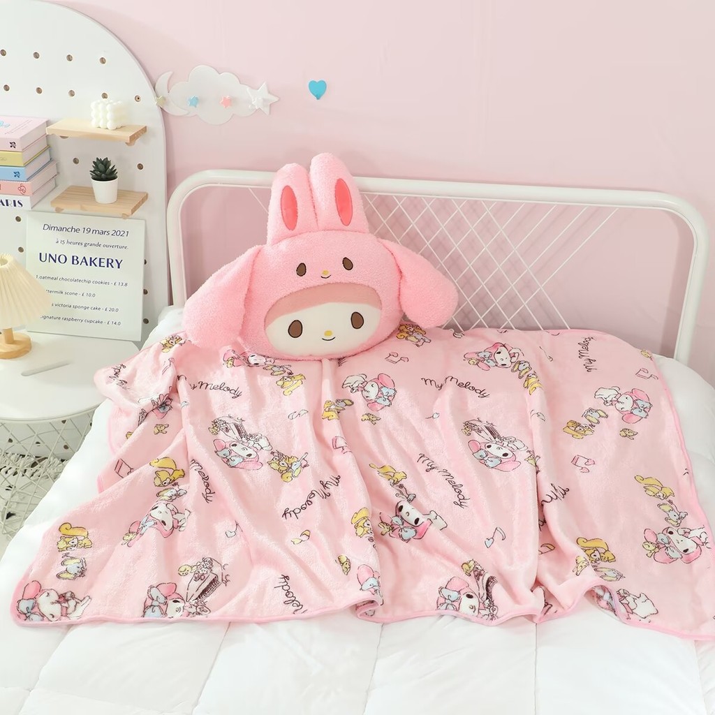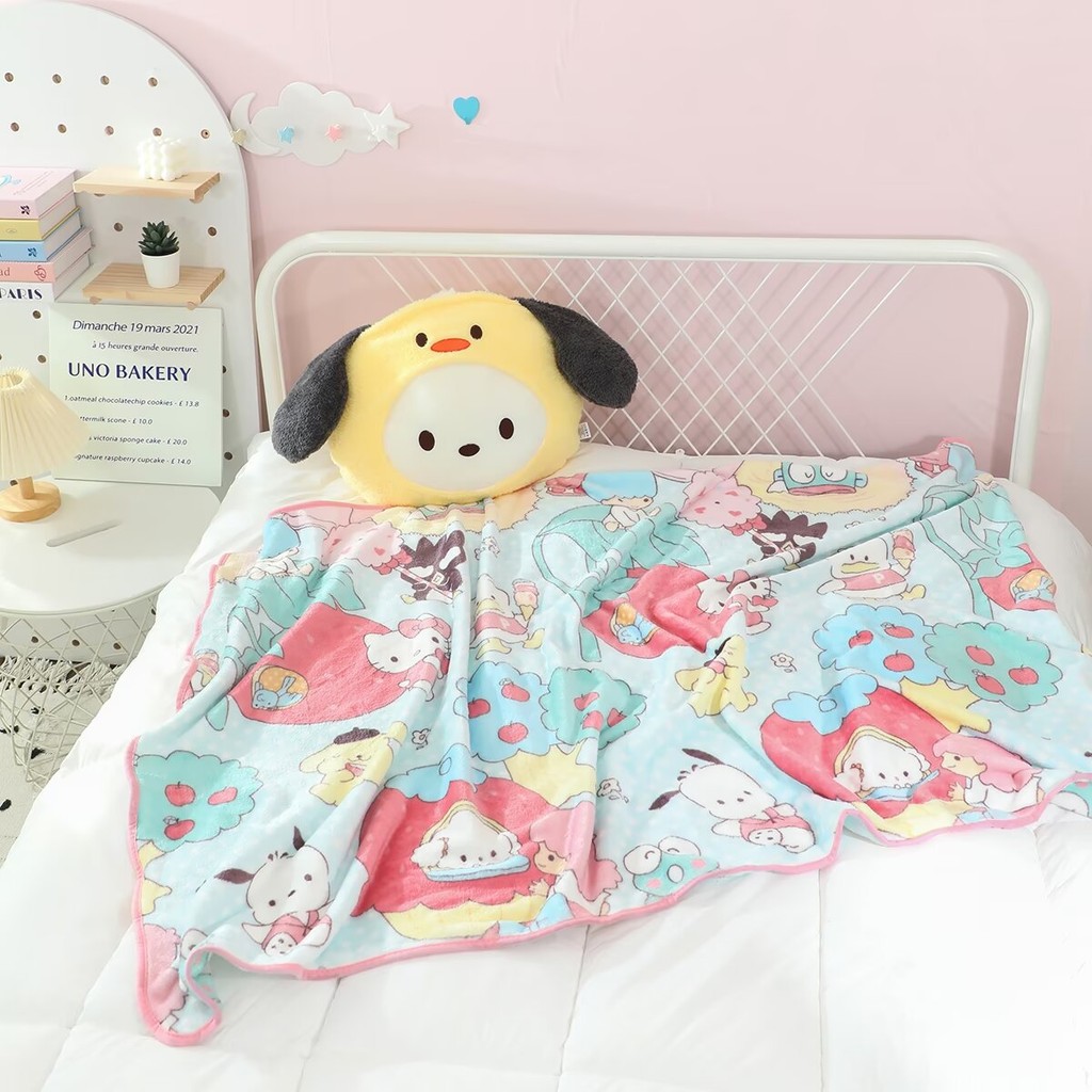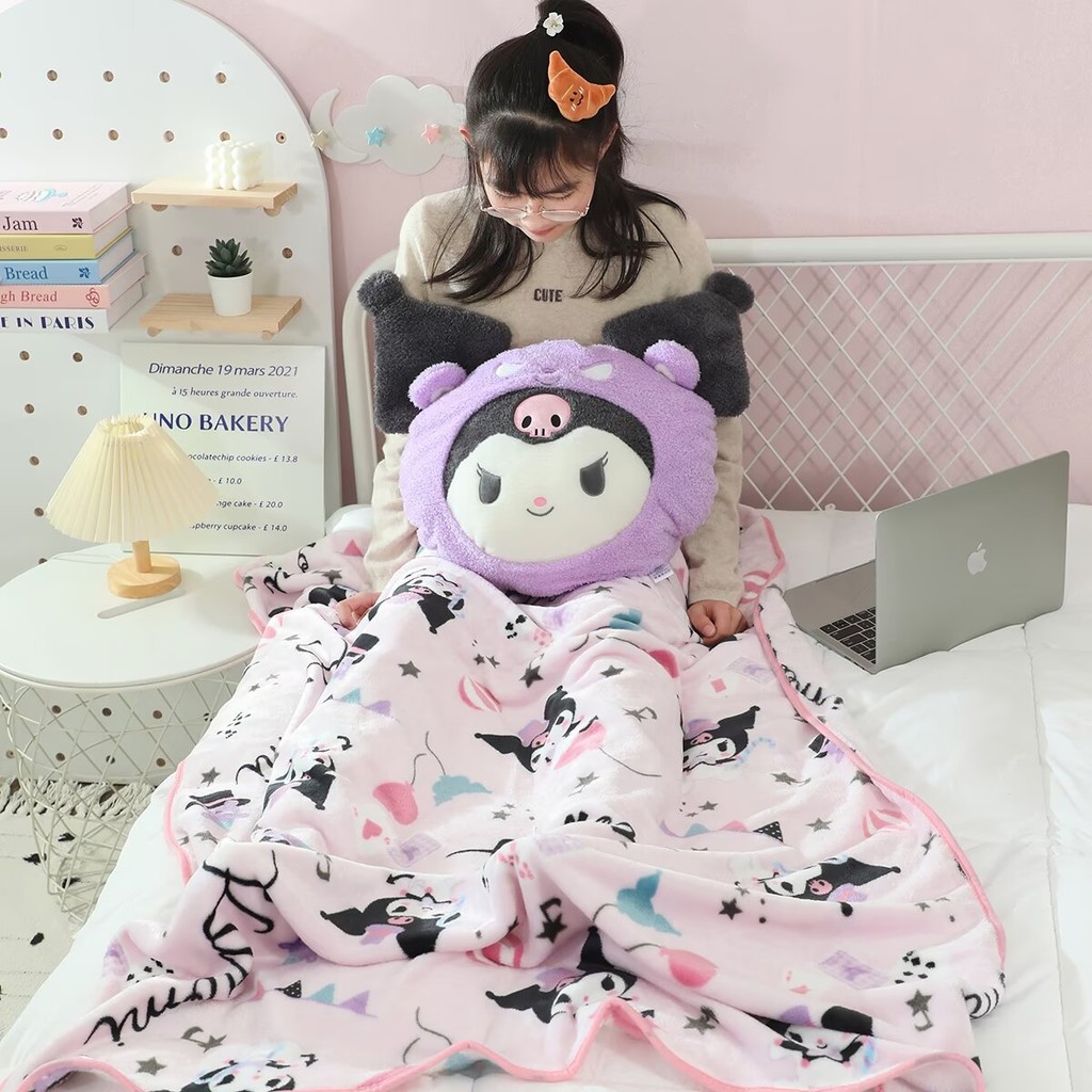 Kuromi My Melody Hello Kitty เบาะรองนั่งรถยนต์และพนักพิงศีรษะและหมอน 2 ใน 1 ผ้าห่ม 1*1.5 ม. หมอน 45 ซม.* 45 ซม.Pachacco PomPom Puri Cinnamoroll